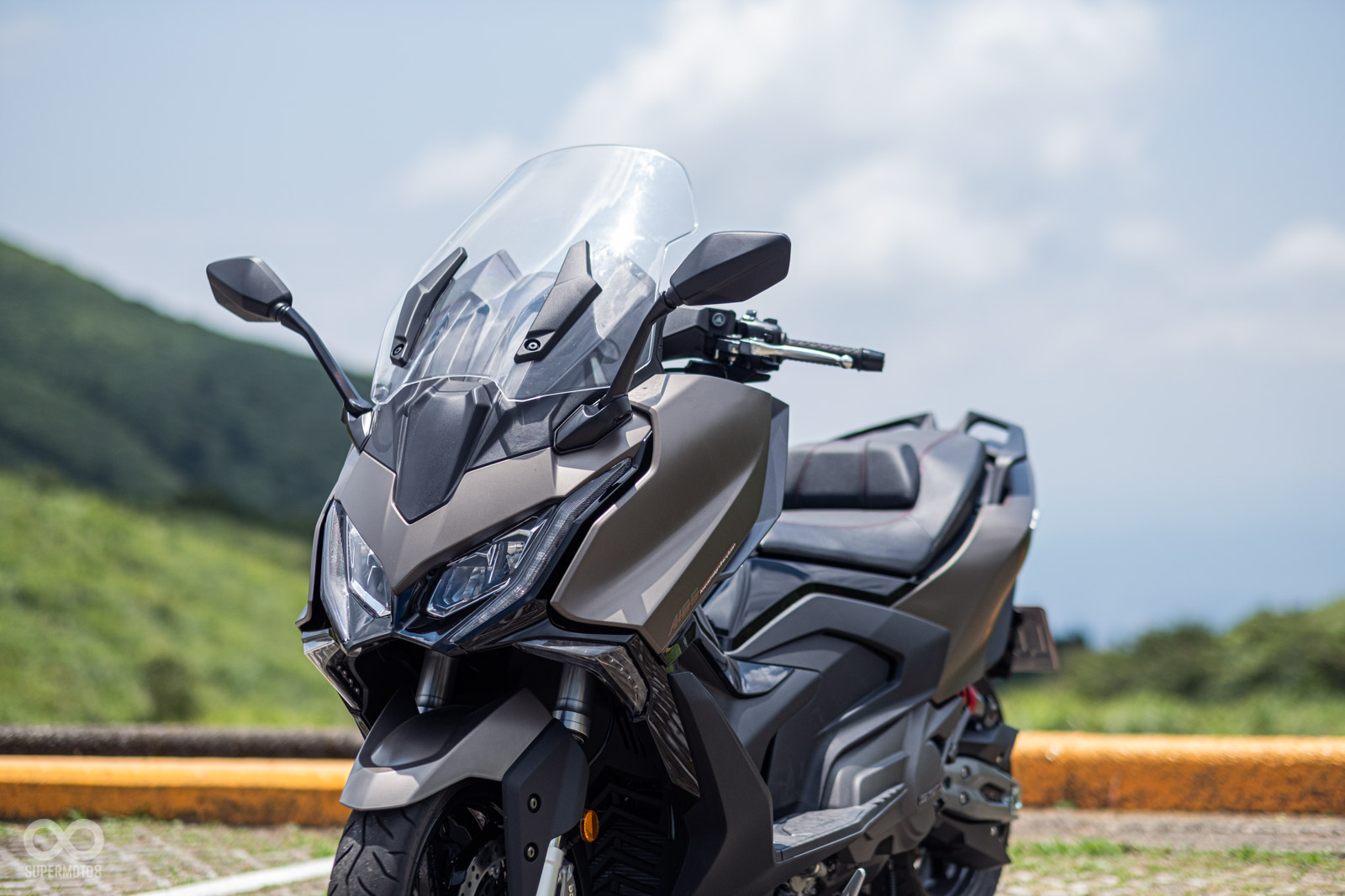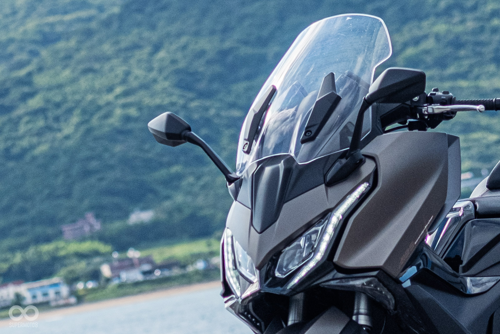 KYMCO透過近年流行的簍空、空氣力學的線條點綴,取代了初代AK550較為複雜的側面線條,包覆式的側面線條看起來更簡潔俐落,車頭看起來也比前一代更有質感,同時也讓AK550 Premium的整個前端部分看起來更有份量感。