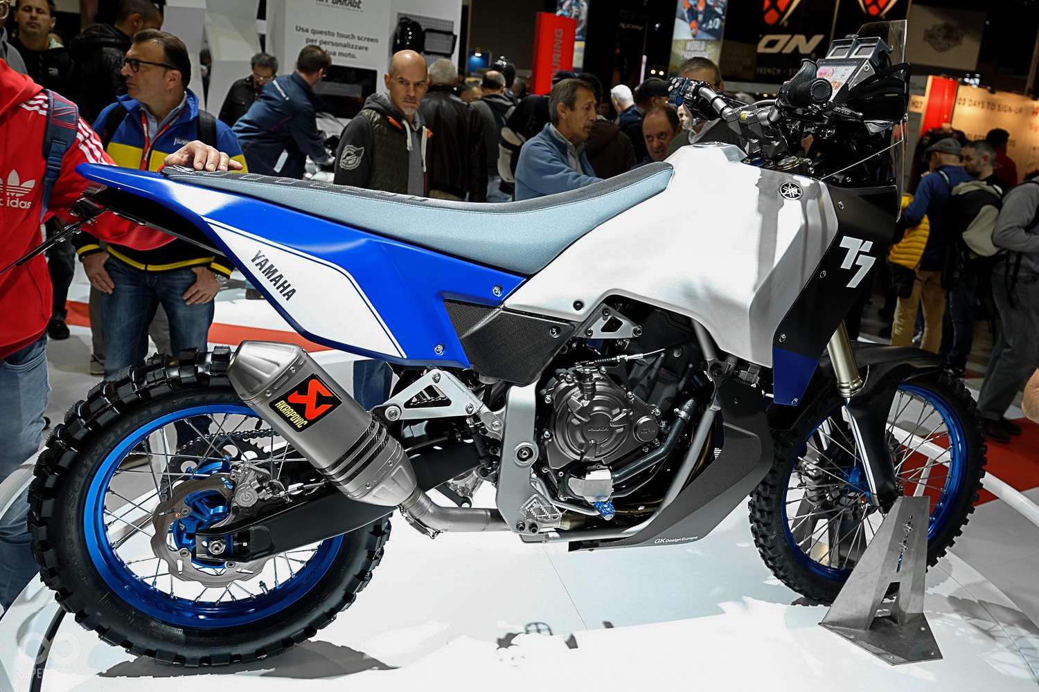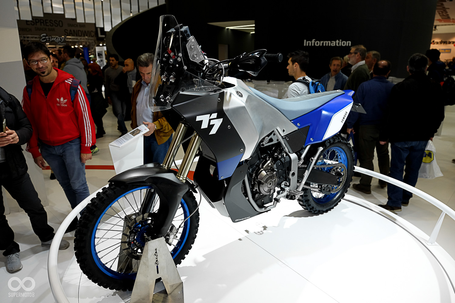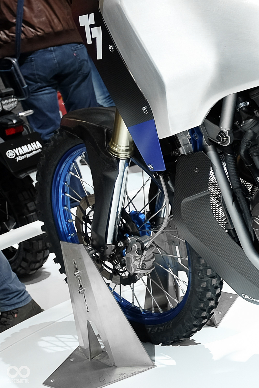 米蘭車展中YAMAHA展場中擺放了台別具特色的概念車款T7 Concept,不同於多功能車型Tracer強調舒適與方便性的都市風格,這台車純粹為了拉力而生,誇張的大腳巧克力胎、粗壯的倒叉、超大容量油箱與四組高亮度魚眼燈具都一再說明著這點,這是台瘋狂的車,僅限給有膽識冒險家。