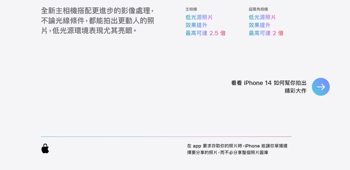 這次iPhone 14在處理器方面沒有太顯著的提升,主要針對圖形處理部分強化,從原本的4個GPU升級為5個,帶來更好的圖形處理能力,對於遊戲玩家來說會有更順暢的體驗。