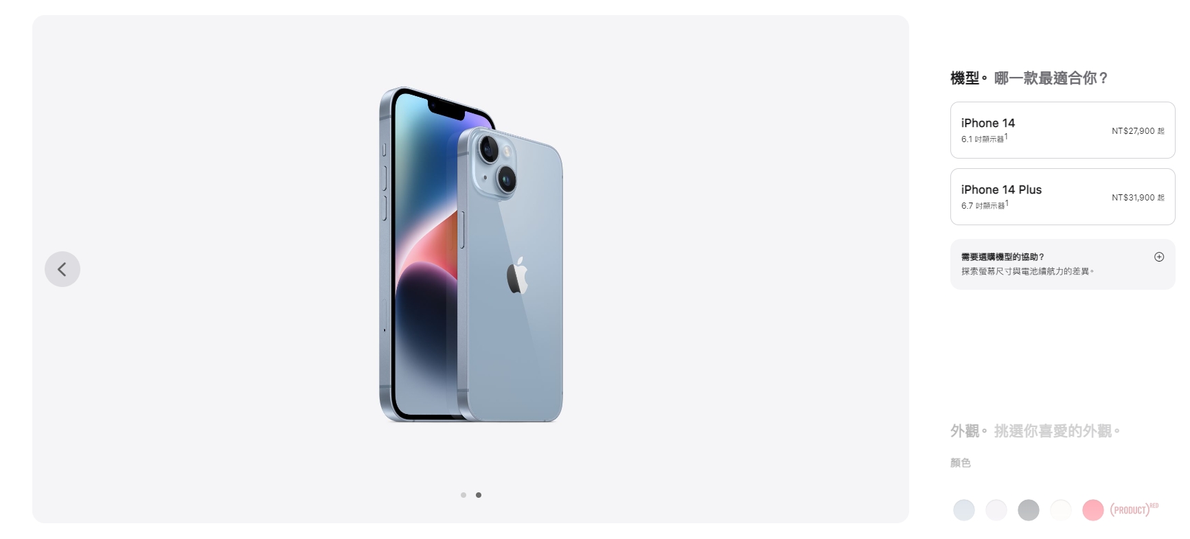 iPhone 14/14 Plus在美國地區也首度推出沒有實體SIM卡的機型,顏色部分則有5種顏色,分別為午夜色、星光色、藍色、紫色以及紅色;建議售價iPhone 14為27,900元、iPhone 14 Plus為31,900元,台灣將於9月9日開始預購,iPhone 14在9月16日發售、iPhone 14 Plus在10月7日發售。