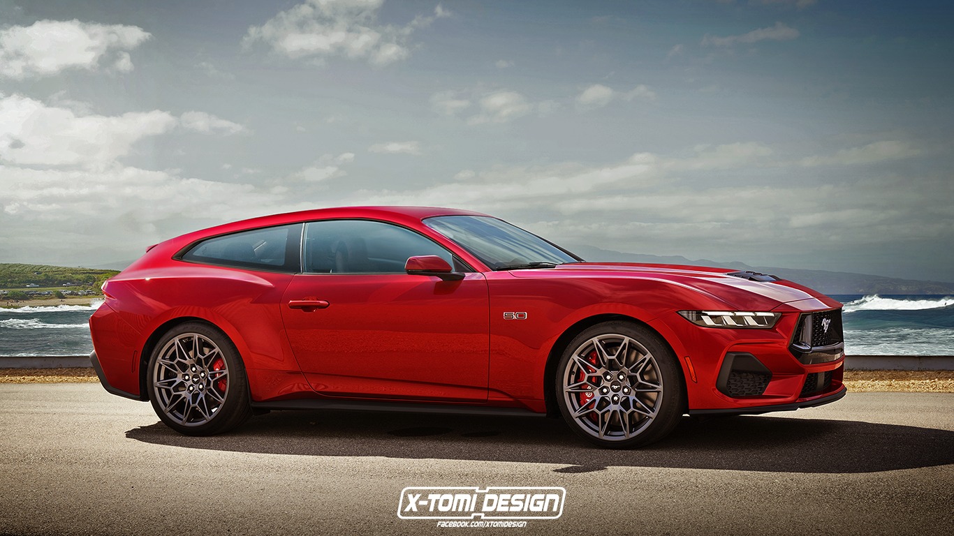 不過,充滿創新點子的國外設計團隊X-Tomi Design顯然有更「前衛」的想法,那就是Ford Mustang Shootingbrake,雖然這並非Ford官方的圖稿,但卻傳達出了美式肌肉車的別種可能性,根據X-Tomi Design提供的圖片,同現行款野馬標誌性的肌肉線條,卻在車尾延伸出更大的車廂空間,並和稍微傾斜的車頂線完美地融合成一個大C柱,雖然雙門設計不變,但是應該能提供較為舒適的後座與更大的收納空間;只可惜X-Tomi Design並未提供尾部的圖片,但也不難想像應該也是套用原廠Mustang的風格。