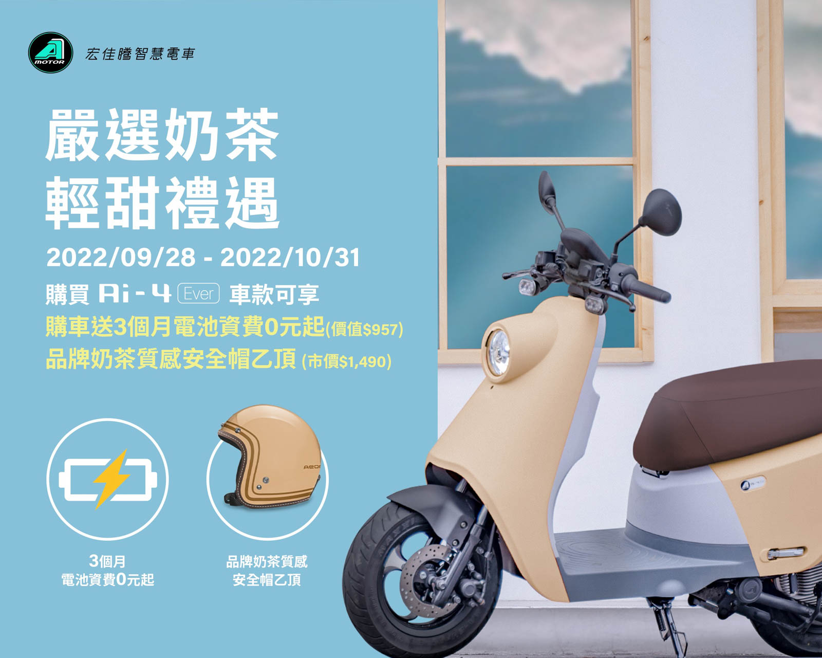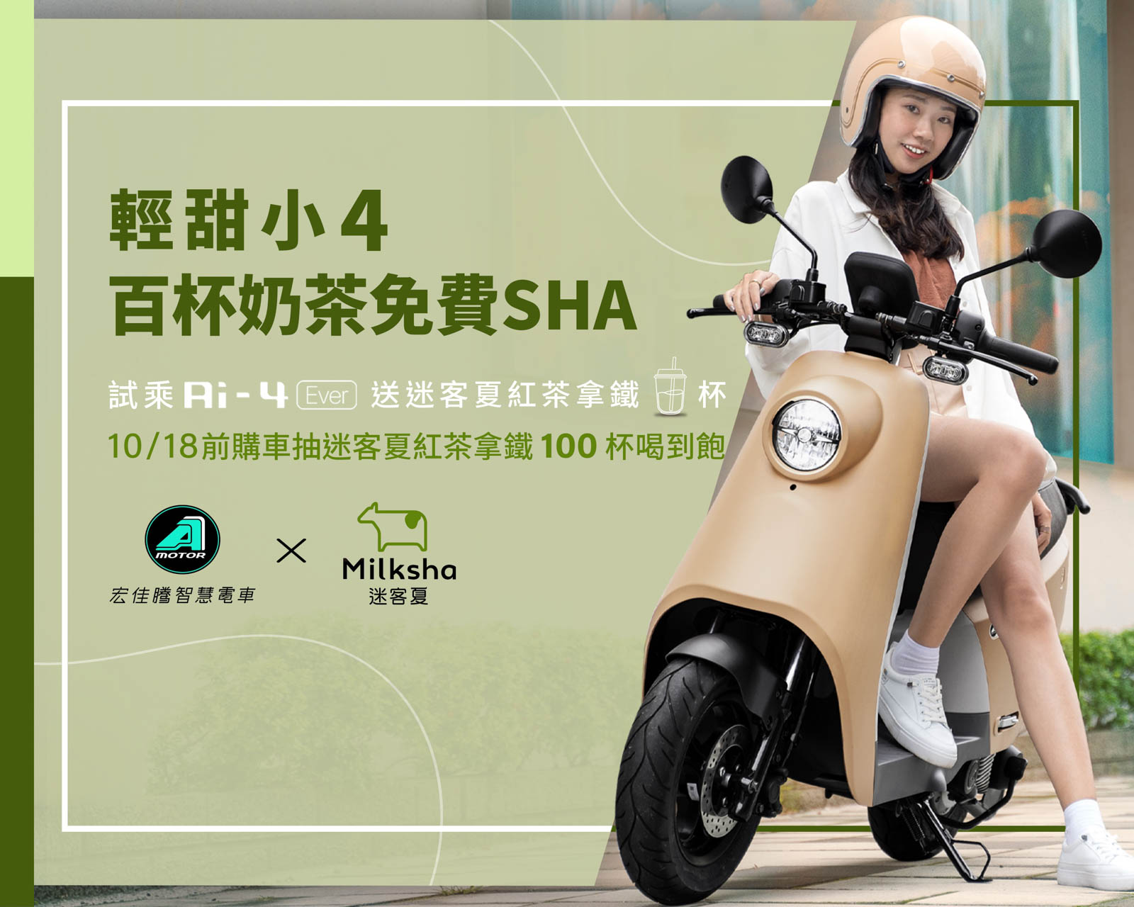 而針對欲入手Ai-4 Ever的民眾,至10月31日前購車,最低入手價36,180元起(原價59,980元,以台北/桃園汰購補助為例),再贈價值1,490元品牌奶茶色安全帽與Gogoro Network電池資費 3個月減免(價值957元),預購再抽百杯《迷客夏》紅茶拿鐵5名,即日起全台宏佳騰智慧門市開放試乘體驗與預購,把握最佳購車時機,敬邀您即刻前往預約試乘賞車。