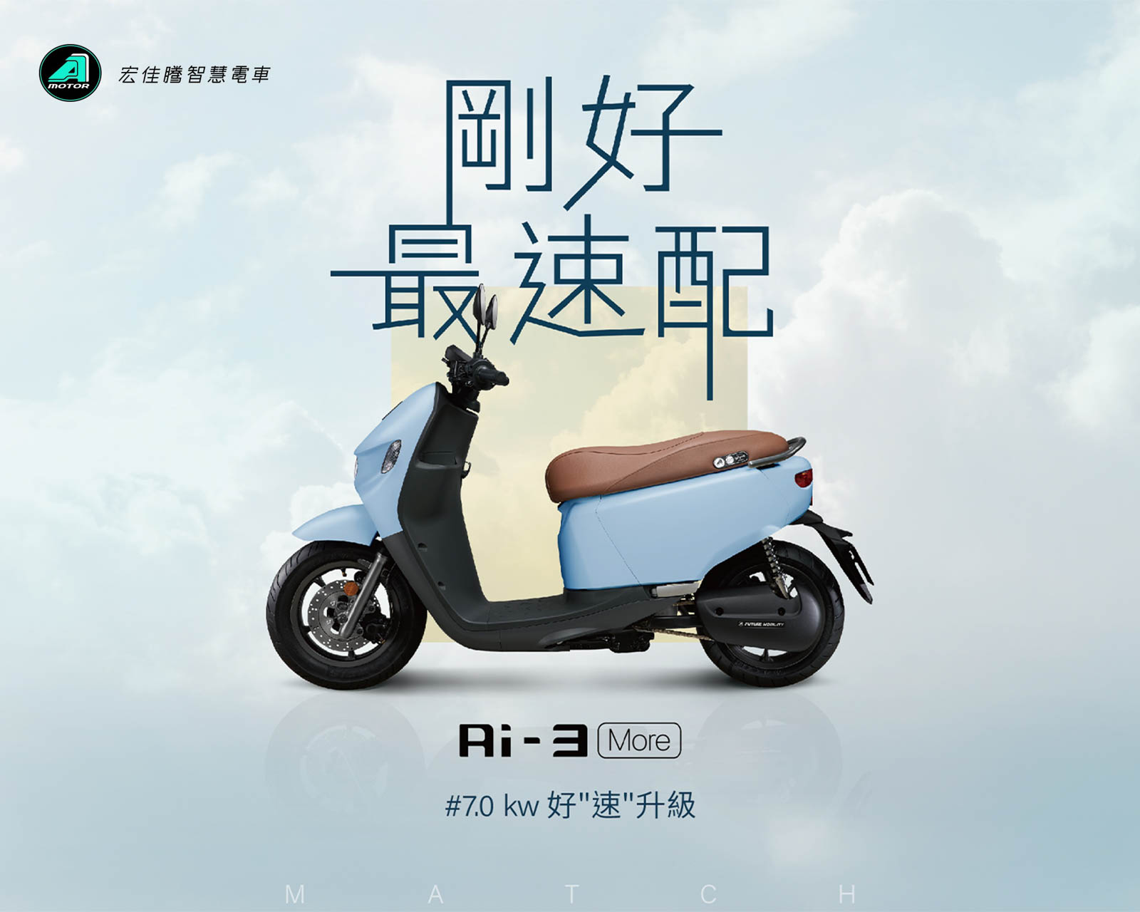 持續精進產品性能與服務,提供民眾更為便利的騎乘體驗,宏佳騰智慧電車此次同步推出Ai-3 More車款。承襲Ai-3 Comfort 親膚觸感、圓潤可愛外型,標配高亮度圓弧汽車等級Class D LED大燈、CBS連動煞車系統與電子倒車鍵等同規車款配置;Ai-3 More在動力系統部分升級採用全新G2.2鋁合金水冷永磁同步馬達,並將最大出力提升至7.0Kw,滿足女性族群追求更高騎乘動力,加速順暢有感的駕馭體驗。