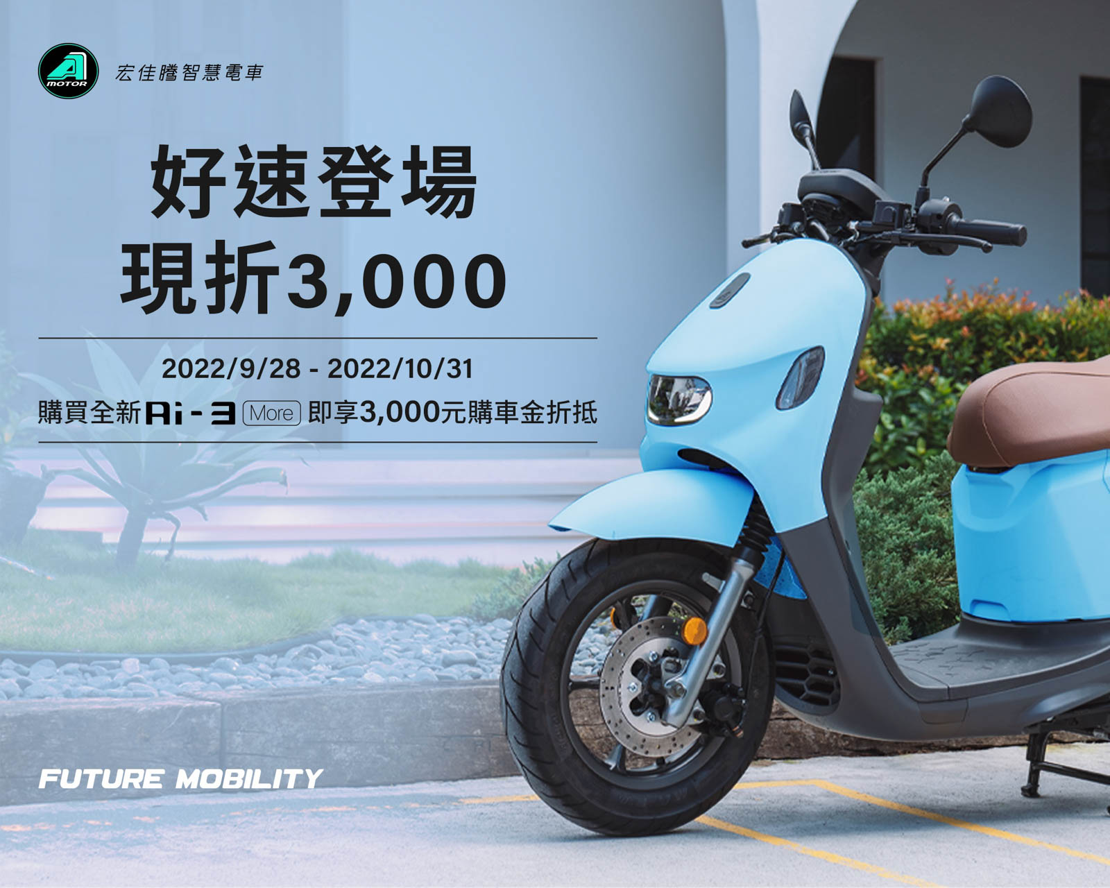 歡慶Ai-4 Ever奶茶新色與Ai-3 More全新上市,宏佳騰智慧電車推出多重購車優惠。即日起至10月31日止,現金購買Ai-3 More車款,再享3,000元購車金折抵,最低55,180元起即可輕鬆入手(原價85,980元,以台北/桃園汰購補助為例)。