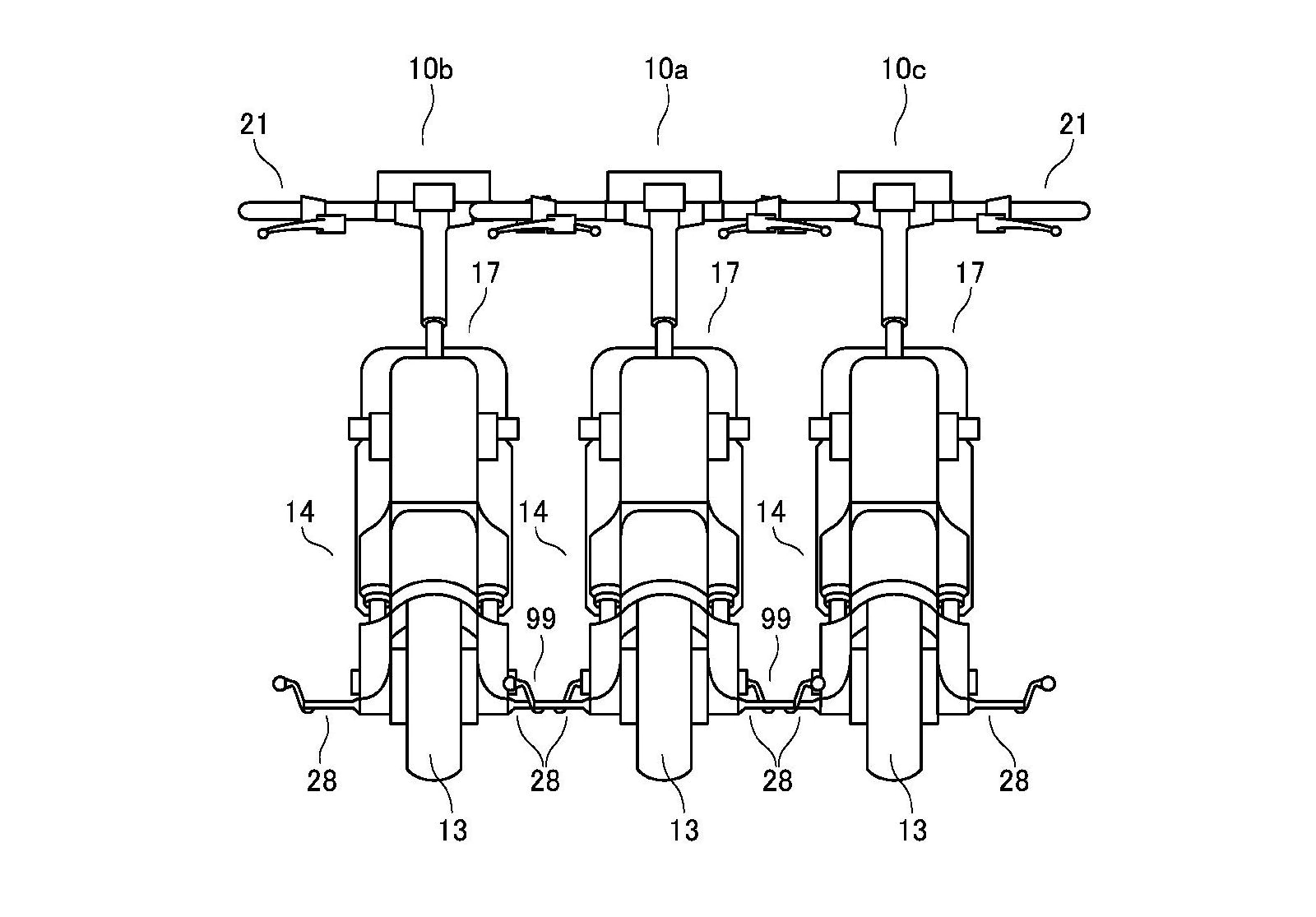 接下來的專利設計就更讓人耳目一新了,為了因應共享自行車的市場,本田發明了自行車的串聯機構,比起傳統共享單車或機車在更換或檢修的過程,必須採用貨車運送,HONDA的自行車串聯機構只需要一位工作人員操作;該機構的腳踏板,可以翻轉出來並連接到另一輛踏板車的前叉,並使用掛鉤球和榫接裝置確保牢固。在由四輛自行車連接成菱形圖案後,藉由精密的電腦計算動力分配下,只需要一位工作人員在前面的自行車上控制油門和轉向,其餘的車輛就能根據頭車的油門以及轉向達成同步工作,並在轉彎時改變它們的相對速度,如此一來,大幅降低共享自行車的調度成本,讓後勤工作更加便捷。