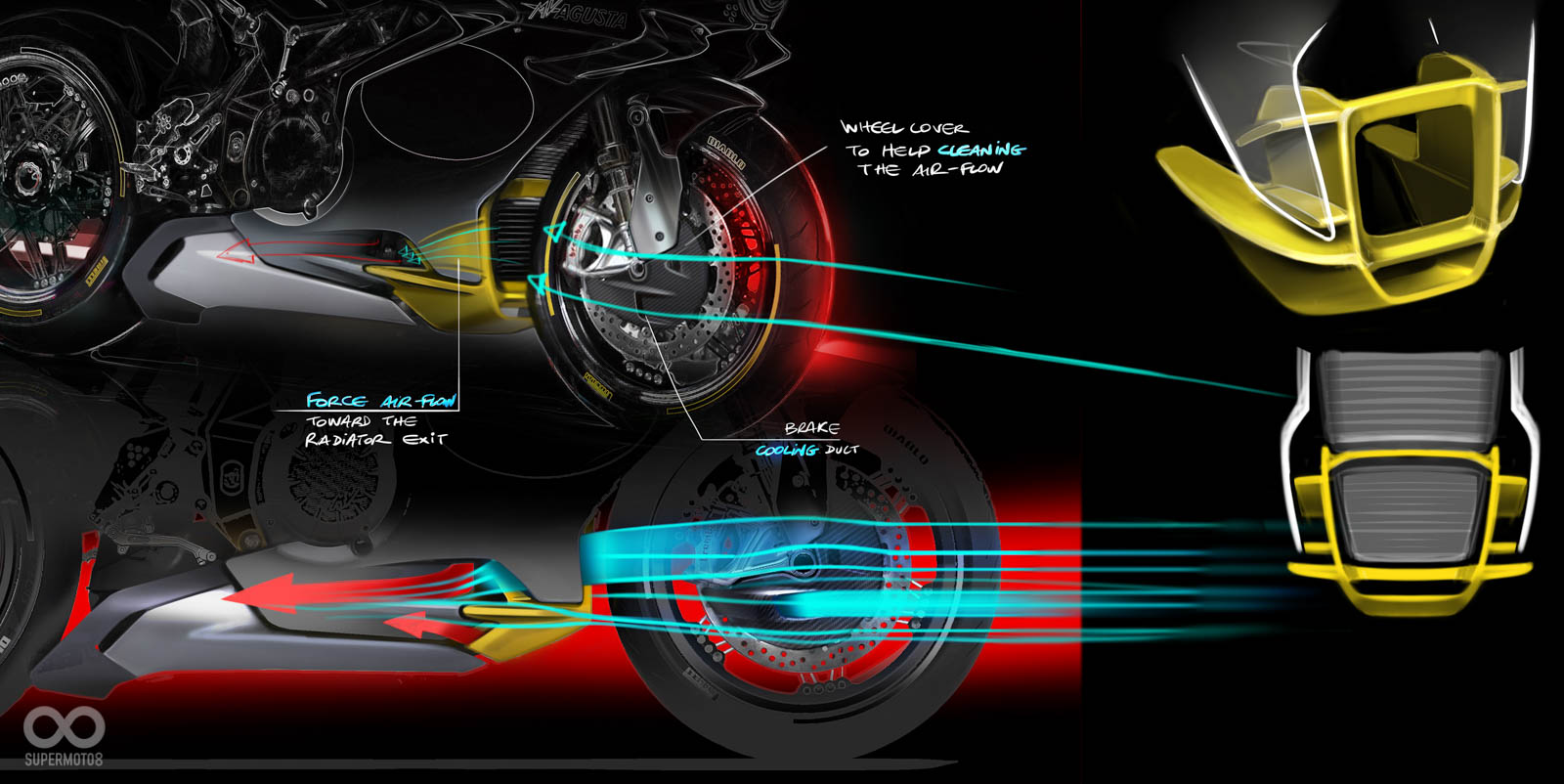 MV AGUSTA Superveloce 1000 Serie Oro的小翅膀空力套件也非虛有其表,MV AGUSTA官方宣稱這組空力套件能在時速318公里時提供39.2公斤的下壓力;此外,煞車碟盤上也能看到近年常見於賽道的散熱罩設計,此外整流罩底部也藏有巧面的空氣力學巧思,MV AGUSTA表示這部分的簍空能在高速時形成真空幫助散熱。