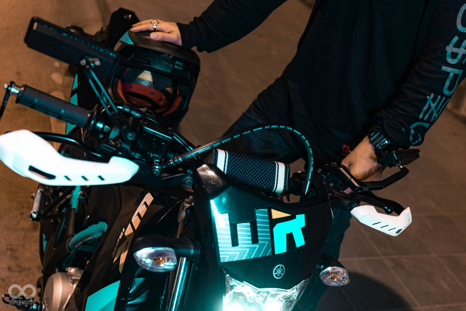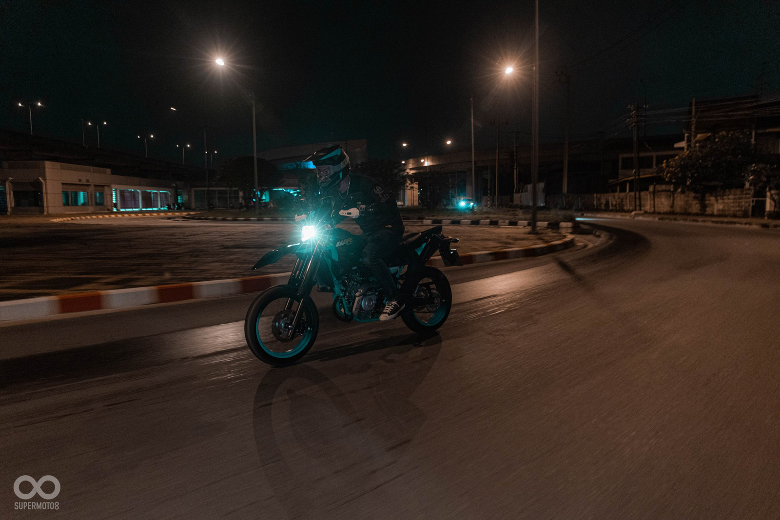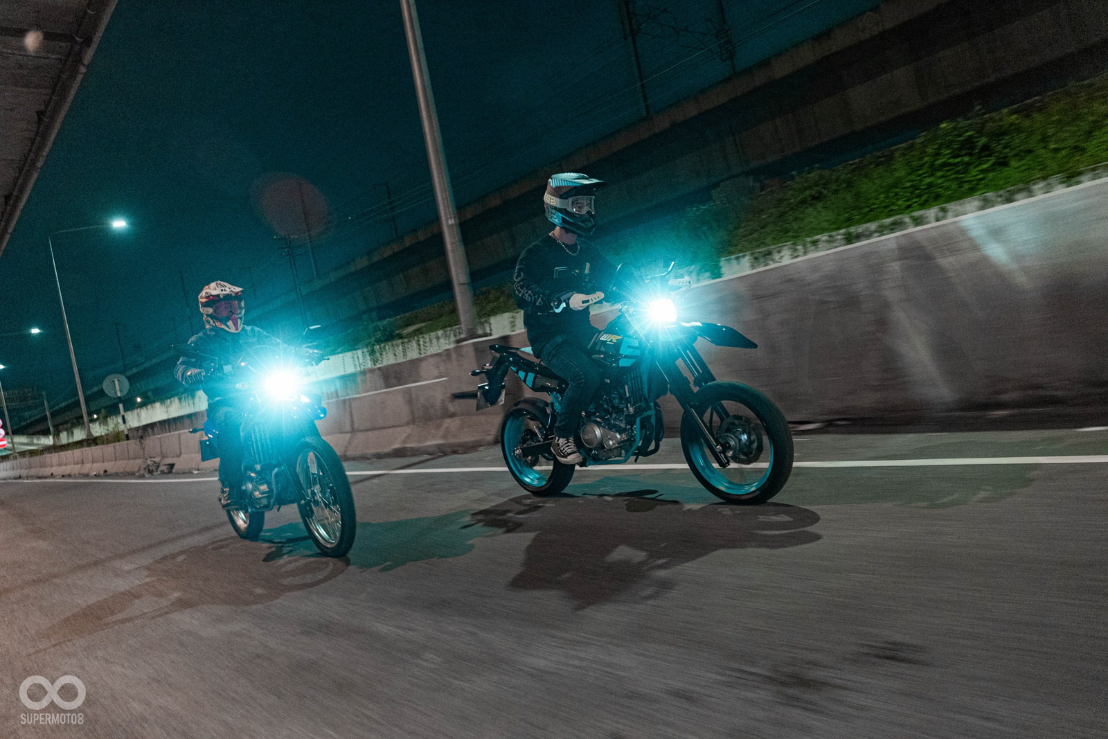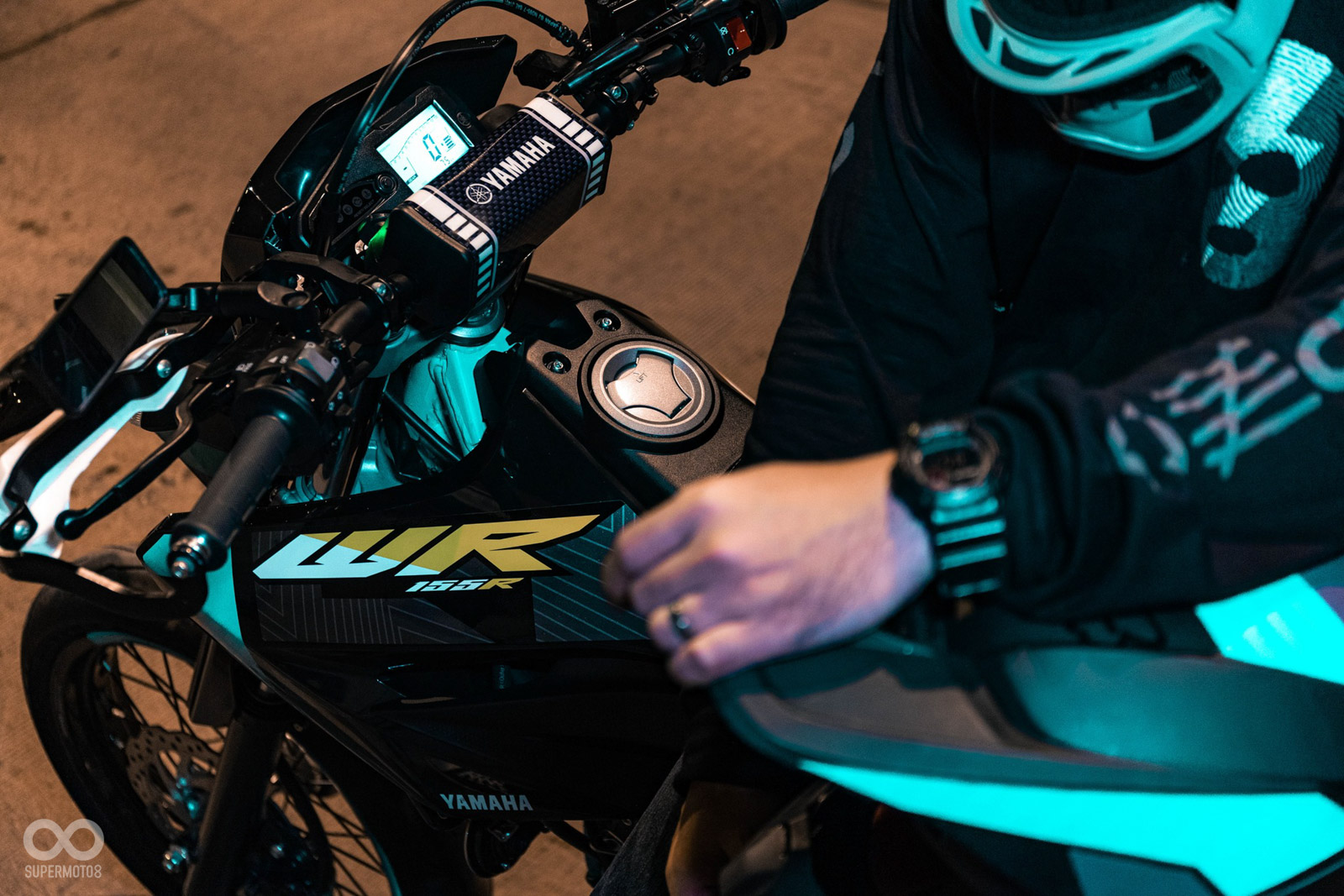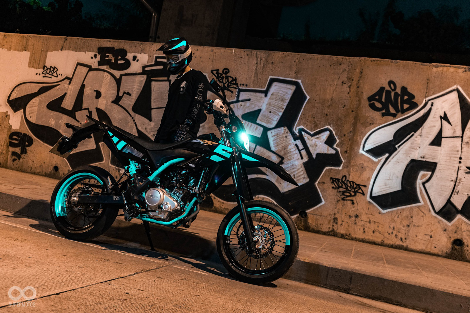 首先從WR155R的外形看去,粗曠簡潔的外觀一目瞭然,大面積的鴨舌土除,以及修長的車型早已為越野車的身分驗明正身,但除了玩土外,本次YAMAHA特別拍攝安裝前後17吋框的滑胎版本,搭配傳承自R15的155c.c. VVA引擎,產生16.5ps馬力和14.3 Nm的充沛扭力、KYB 41mm正立式前叉、五段預載可調的單槍避震器,加上原先越野取向造就的輕盈體態,想必改裝後能夠輕易成為都會小霸王。