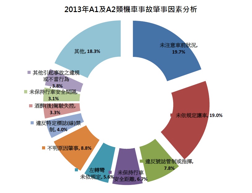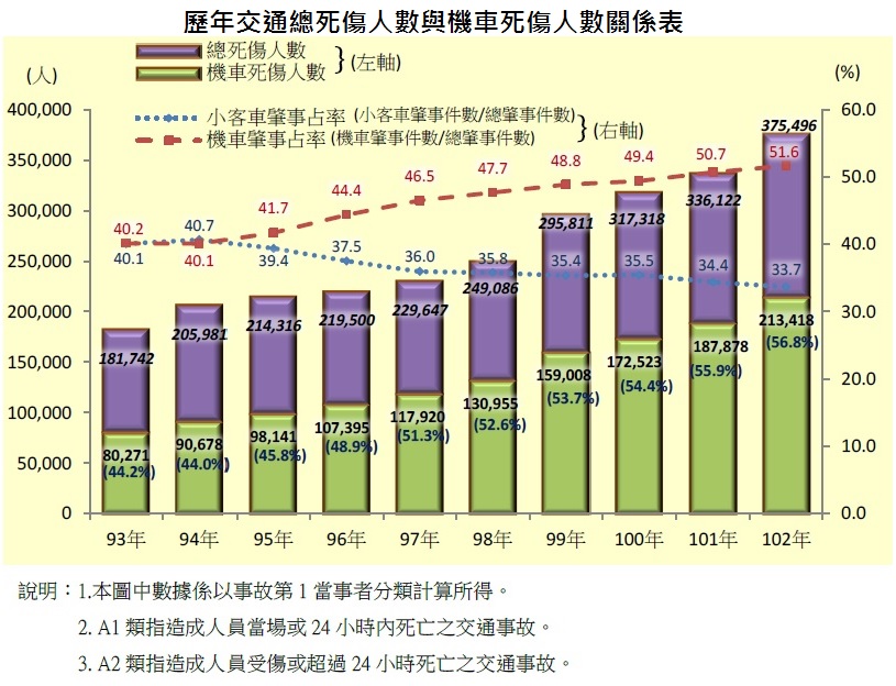 這裡稍微提一下有關台灣交通意外的統計,在2013年全年約有21萬人次的機車騎士因車禍受傷或死亡,超過整體交通死傷人數的一半,這個比例從2004年起就逐漸攀升。