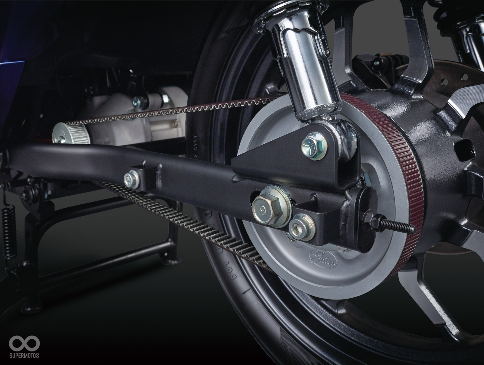 eReady 台鈴智慧電車此次與美國大廠Gates合作,首次導入的皮帶傳動系統,eReady Run mini 70 Belt 與 eReady Run 76 Belt傳動系統採用Gates碳纖維高張力皮帶,由於少了鍊條與齒盤間金屬接觸的聲響,騎乘起來相當安靜,並搭配eReady台鈴智慧電車,獨家日本重機調校的後輪鼓減震設計,相較他廠有著更加穩定及降噪的騎乘體驗,而皮帶也無須定期清洗保養,在台灣多雨的天候環境下更加便利,只要注意清潔就能常保傳動系統的順暢性。