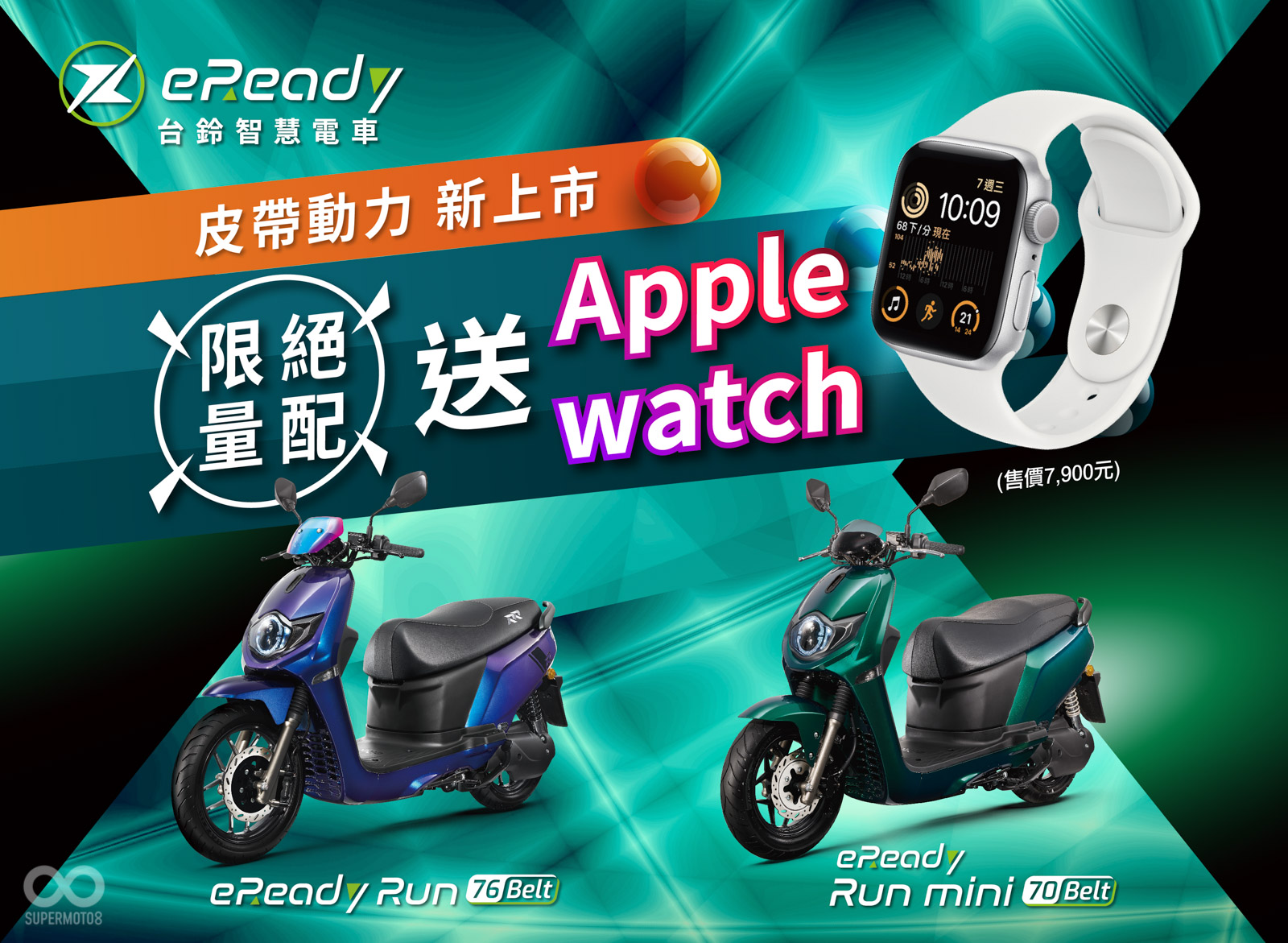 為歡慶eReady Run mini 70 Belt 與 eReady Run 76 Belt上市,即日起推出首波購車優惠活動,前60名購車之消費者,即贈送Apple Watch SE 1只(市值 7,900 元),送完為止。歡迎消費者即刻至各地門市洽詢。