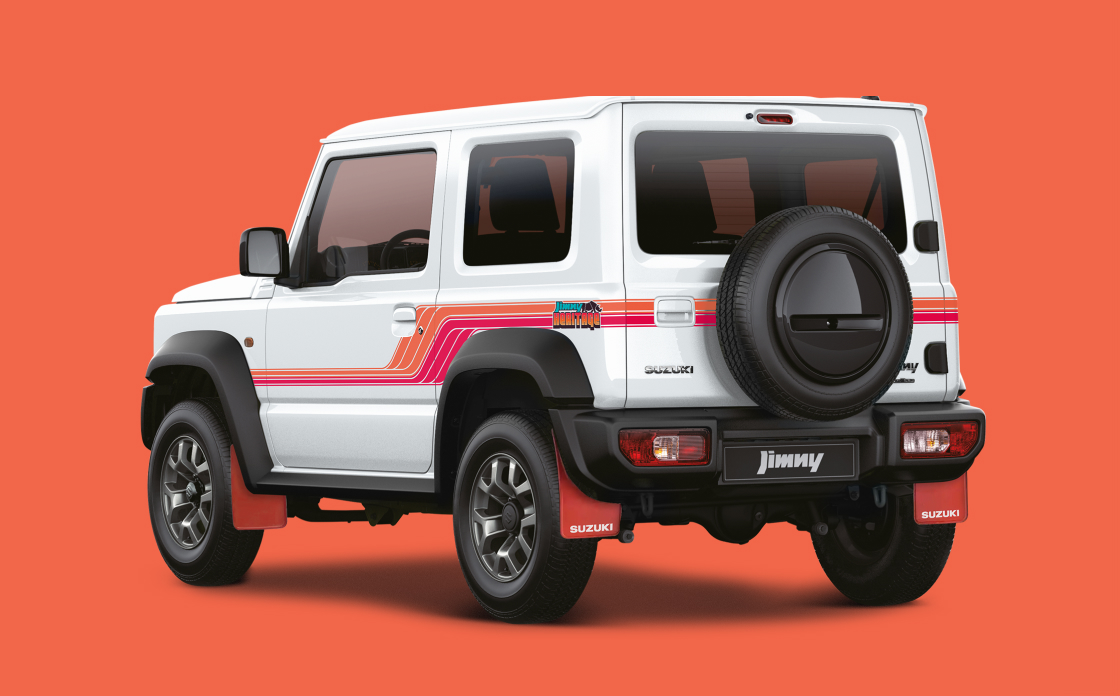 Jimny 方正的外觀造型,原本就頗有復古氛圍,而在 Jimny GLX 車型原有車型的基礎上,Suzuki 利用了紅色的擋泥板、自車側環繞車尾的橘紅雙色線條拉花飾貼、與犀牛圖案的車型專屬徽飾,來為 Jimny Heritage 特仕版車型增添 80 年代的懷舊感,車型配色則推出黑珍珠色、叢林綠、白色、與中灰色的四種顏色。