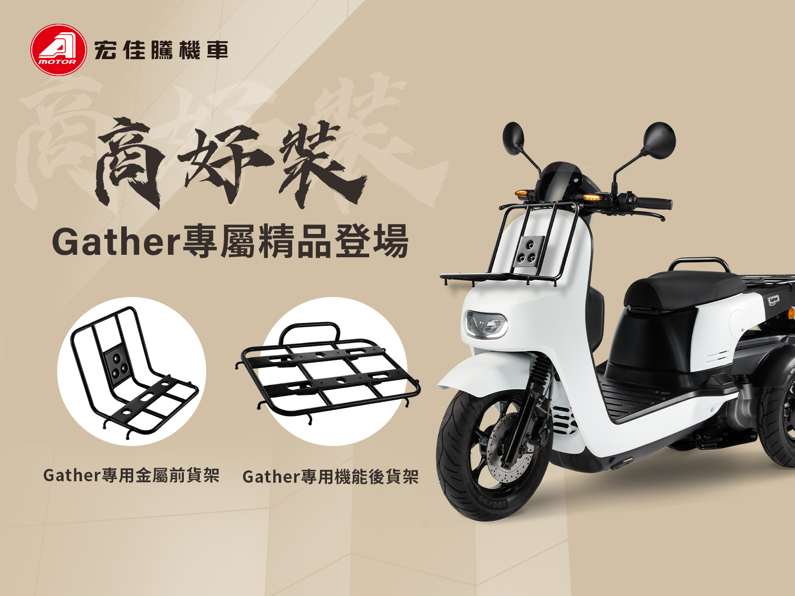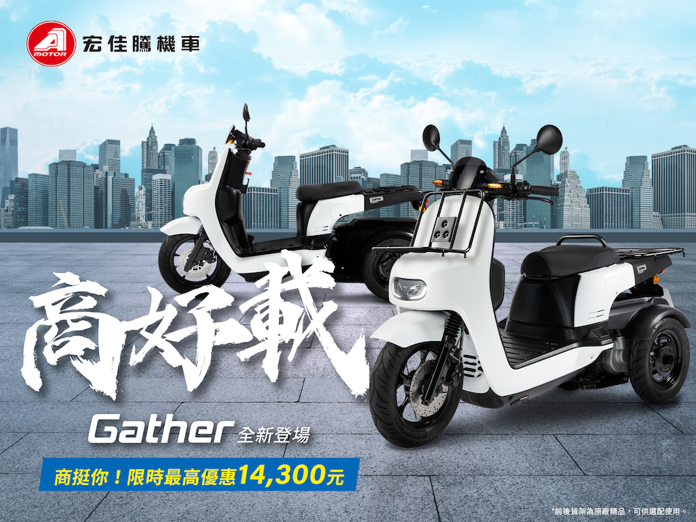 至於標榜安全、靈活、好騎好載,專為商務而生的全新Gather 125三輪商務車,不僅是宏佳騰跨足商用運輸市場的主力重磅車款,也是繼2021年10月底發表全台首款電動三輪商務車款Ai-2之後,Gather車系再次為消費者帶來不同動力選擇的新產品。為了提供廣大頭家們「商好載、商輕鬆」的騎乘與用車體驗,全新Gather 125的後雙輪傳動系統採用三點一面設計,行駛時除了重心更穩定,更具備超越三輪車款的轉向能力,轉彎時可同步調配兩組後輪速率,過彎時依然能夠保持平穩載貨,無須擔心路面顛簸;其配置的Class D頂規汽車等級頭燈,讓夜間行車視野依然清晰無虞。全新Gather 125擁有多樣化的裝載性,提供了"46公分加寬前腳踏"、"52公分加寬後置物空間"、"高彈性前置物空間"三大空間展現強大的載物能力,除了提升上下車及騎乘時的便利舒適性,同時能夠輕鬆地置放外送箱,後置物空間的平坦化設計,讓載運貨物時更加穩固牢靠,搭配省力駐車拉桿的輔助,即使貨物較重也不用因為立中柱或踢側柱,額外增加工作負擔。此外,原廠也特別針對全新Gather 125推出專用金屬前貨架(建議售價$2,566元)、專用機能後貨架(建議售價$2,951元)等精品系列,讓騎士可自行選購搭配運用。