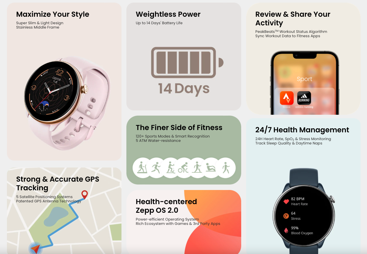 Amazfit GTR Mini內置了280mAh的電池,在正常使用情況下續航長達14天、省電模式下續航長達20天;它還採用“圓極化GPS天線技術”專利技術,提供戶外活動時更準確追蹤軌跡;此外,Amazfit GTR Mini可以全天候監測心率、血氧、壓力水平、睡眠質量和睡眠階段等生理指數 ,並在需要時發出警報提醒使用者調整生活方式。