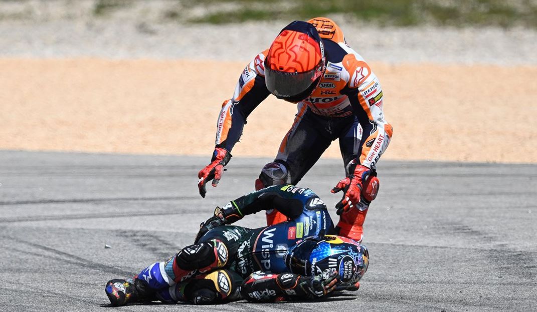 這位八屆世界冠軍,在Portimao賽道第三圈的第三彎中,因為剎車失控而不得不放開制動系統。為了讓他的RC213V可以有足夠空間直立並且較寬敞的緩衝距離,Marc Marquez的路線上直接插進了內線並且開始外拋,隨後撞上了Jorge Martin的後方,並且繼續往前方的Miguel Oliveira側向撞去。