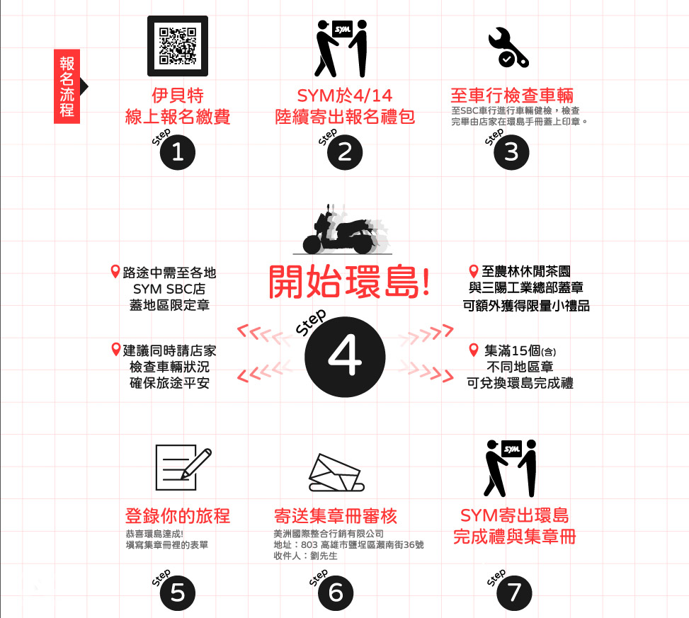 活動報名於 4/7~4/30(報名人數有限,請盡速報名),快和 SYM 一同「Start Your Miles 用熱血驅動疆界」,騎乘機車環島發現更多台灣美麗新樣貌!