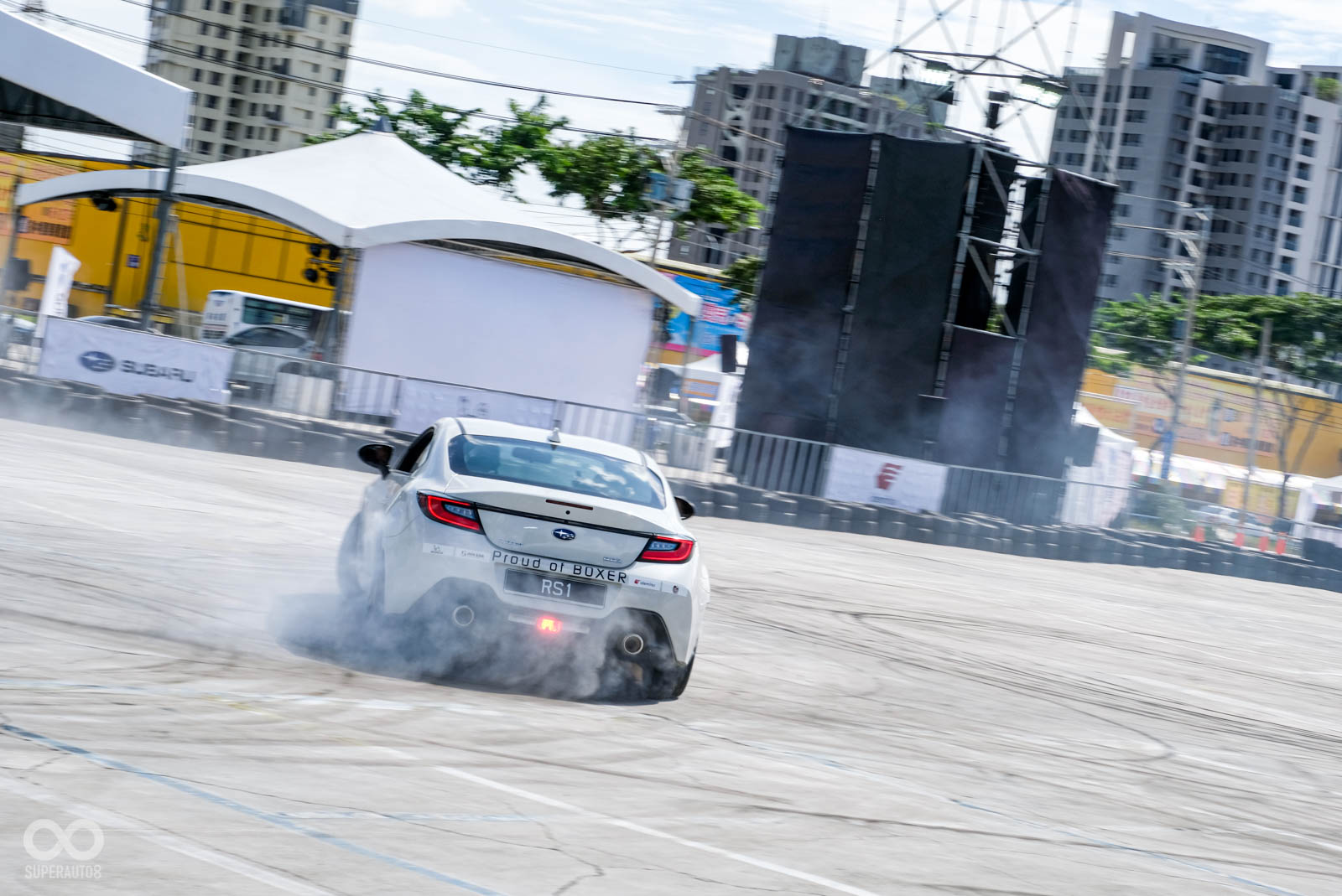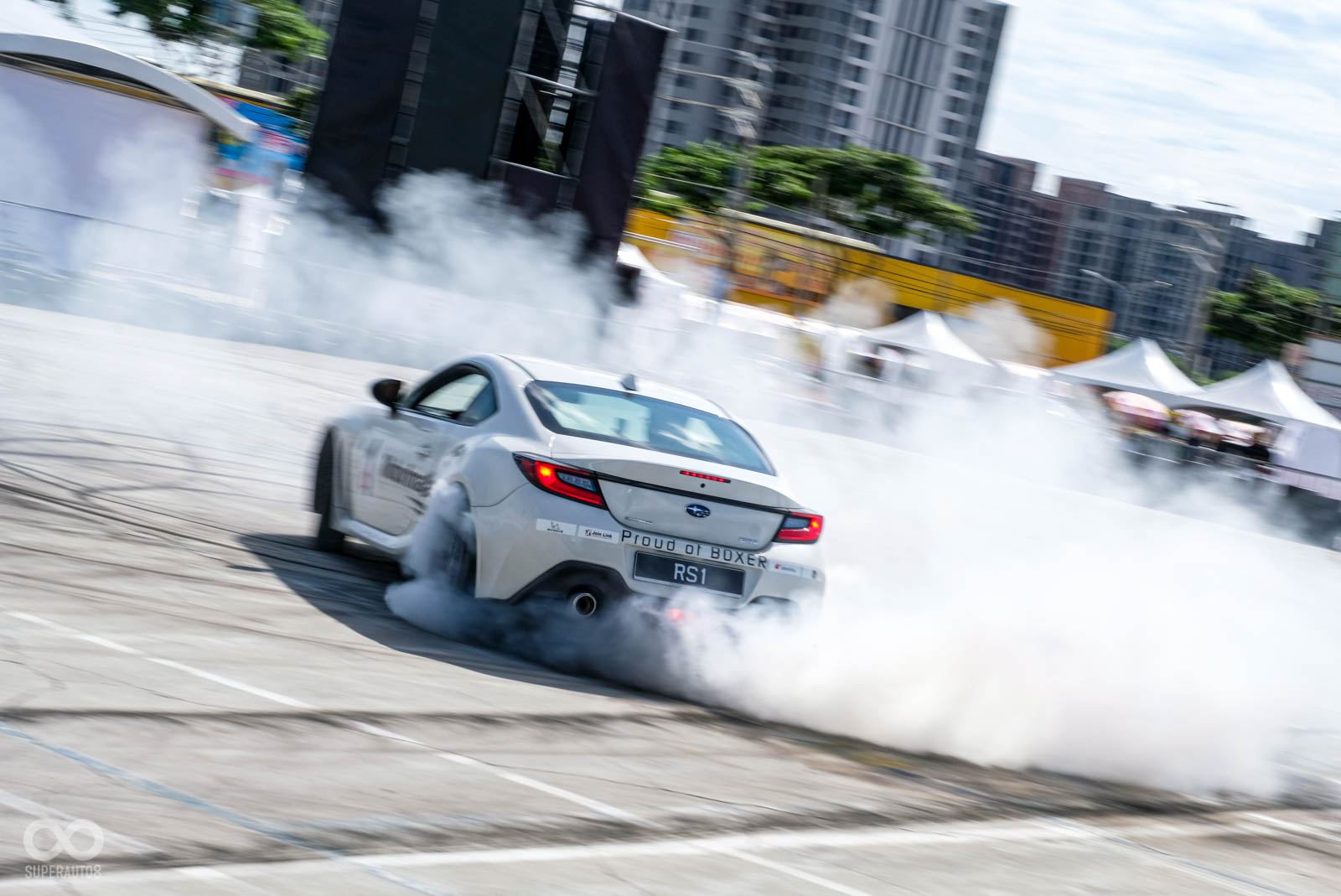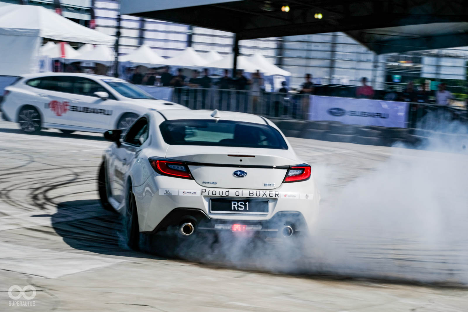 這次的演出中Russ Swift駕駛性能強悍的全新超性能房車The All-New WRX華麗出場,在撼動人心的音樂旋律鼓動下,一氣呵成完成令人驚心動魄的J-turn急轉、Reverse Parking調頭停車、Parallel Parking甩尾停車、Dance Routine飄移。緊接著由SUBARU經典跑車BRZ帶來Doughnuts甩尾繞圈,現場氣氛在熱血的燒胎味和煙霧中再創一波高潮。而Russ Swift也在現場邀請幸運粉絲一同下場開甩,實際上車體驗極限飄移的震撼力,為SUBARU極致安全車款在性能與車體剛性的強悍實力做出最佳見證。