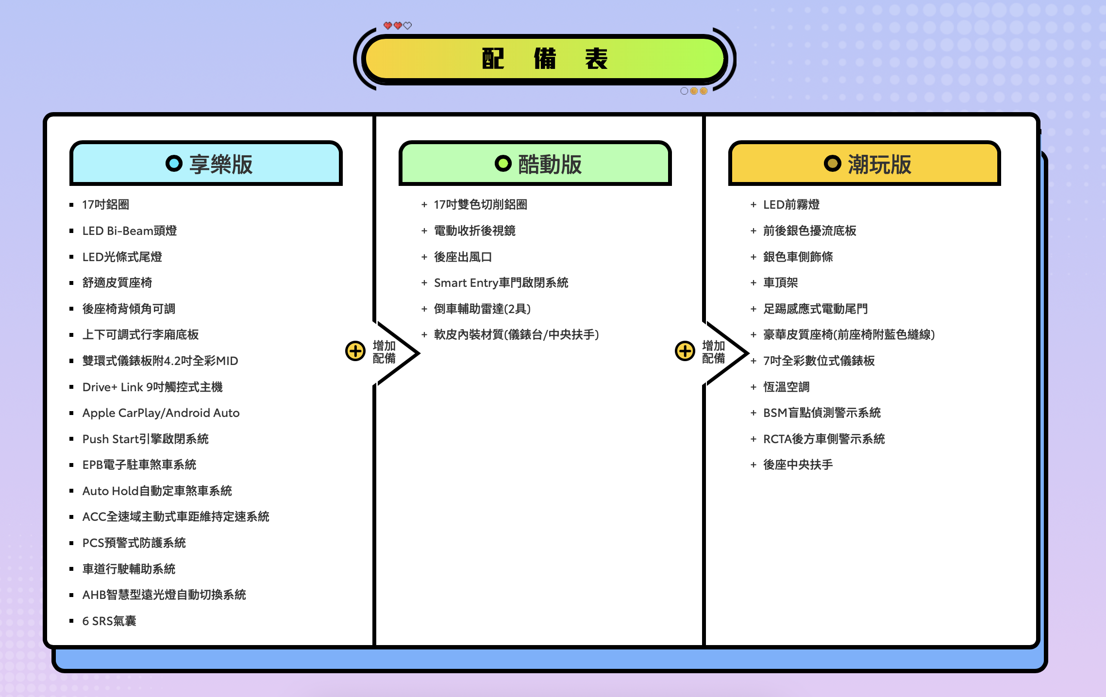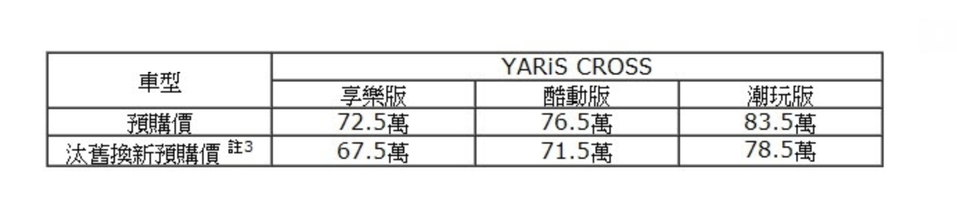 目前TOYOTA YARiS CROSS提供享樂、酷動、潮玩版共三等級以滿足不同消費者需求。車色選擇上,提供雪貂白、極光銀、雲河灰、檀木黑、炫魅紅及奔放藍六種外觀車色供消費者選擇。和泰汽車也持續以72.5萬元/76.5萬元/83.5萬元,三等級預接單價接單中,如果你正在觀望這台輕SUV,別忘記週末趕緊詢問展間是否有實車展示,前往賞車吧!