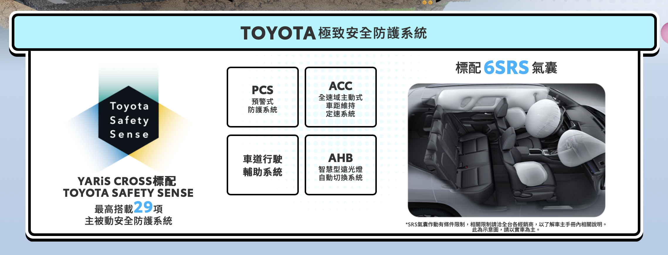動力與安全方面,YARiS CROSS搭載全新調校的1.5升Dual VVT-i引擎動力,更在全車系標配Auto Hold與電子手煞車,大幅提升駕駛便利性;搭配6SRS氣囊及TOYOTA SAFETY SENSE安全系統,包含消費者重視的ACC全速域主動式車距維持定速系統、車道行駛輔助系統等主動安全配備。另搭載BSM盲點偵測警示系統(潮玩版)、RCTA後方車側警示系統(潮玩版)等,最高搭載29項主、被動安全配備。