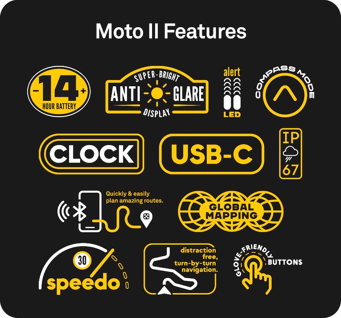 Moto II 在原始版本的基礎上進行了多項改進。它配備了一個顯著更大、更高解析度、防眩光的 TFT 彩色螢幕。您可以聽到即將到來的轉彎警報,並且 LED 燈提醒您。600mAh 電池容量讓您享受長達 14 小時的使用時間。此外,搖杆式功能開關更適合戴手套的操作,讓您在騎行時更加方便。