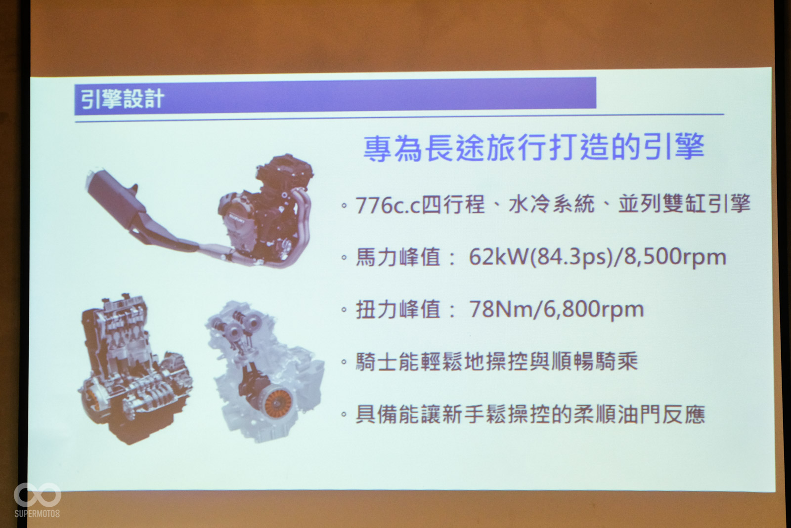 V-STROM 800也同樣使用全新的776c.c.並列雙缸引擎,馬力稍微比8S/8R大一點點,來到84.3PS @ 8500RPM,最大扭力一樣為78Nm @ 6800RPM。