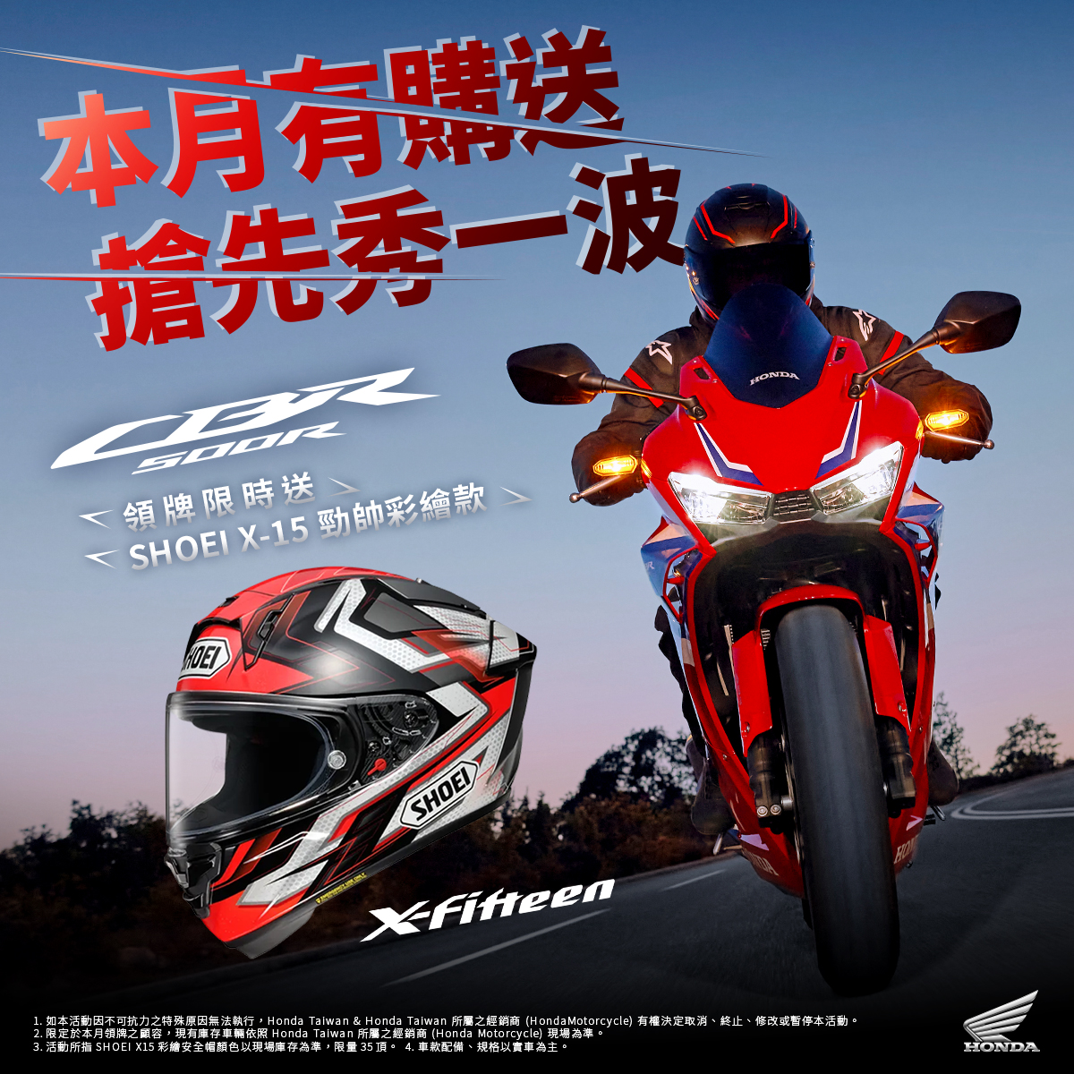 為了鼓勵所有喜愛Honda熱血SPORTS車系的顧客加入自由自在二輪生活的行列,並一起享受騎乘的樂趣,即日起訂購全新2024年式CBR500R並完成領牌,即贈SHOEI X-15彩繪款安全帽,數量有限,歡迎所有熱愛Honda的粉絲,趕快至全國經銷據點選購屬於自己的車款吧!