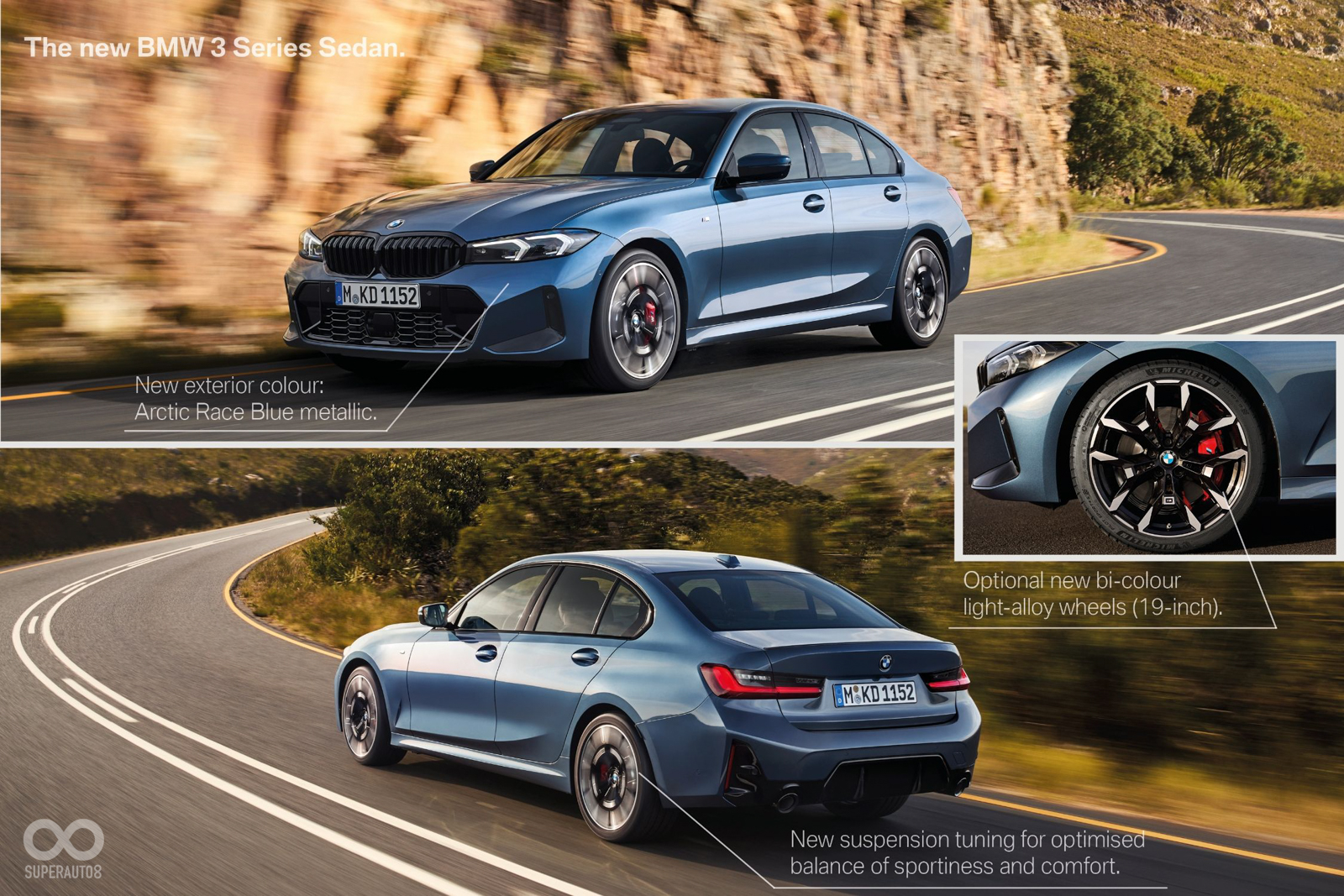 新款 BMW 3 系列在外觀上進行了細節調整。顏色方面新增了北極競速藍和火紅色兩種金屬漆,並提供多款新式鋁合金輪圈,搭配 M 運動化套件,使車輛更具動感。