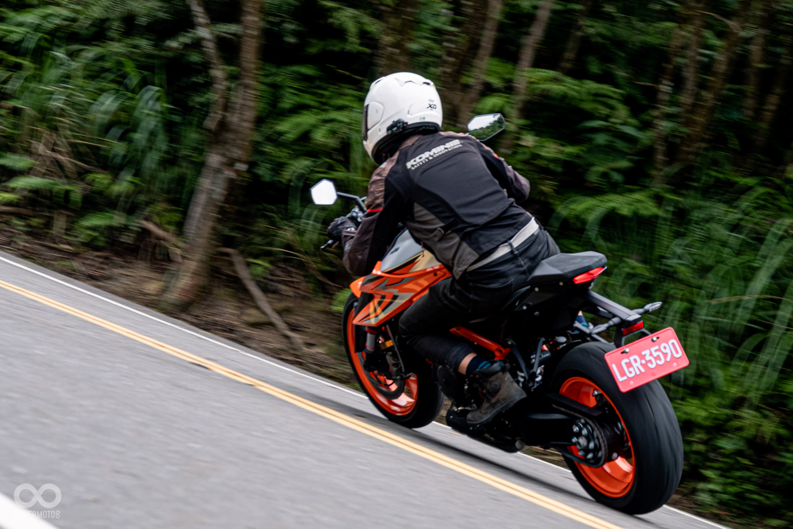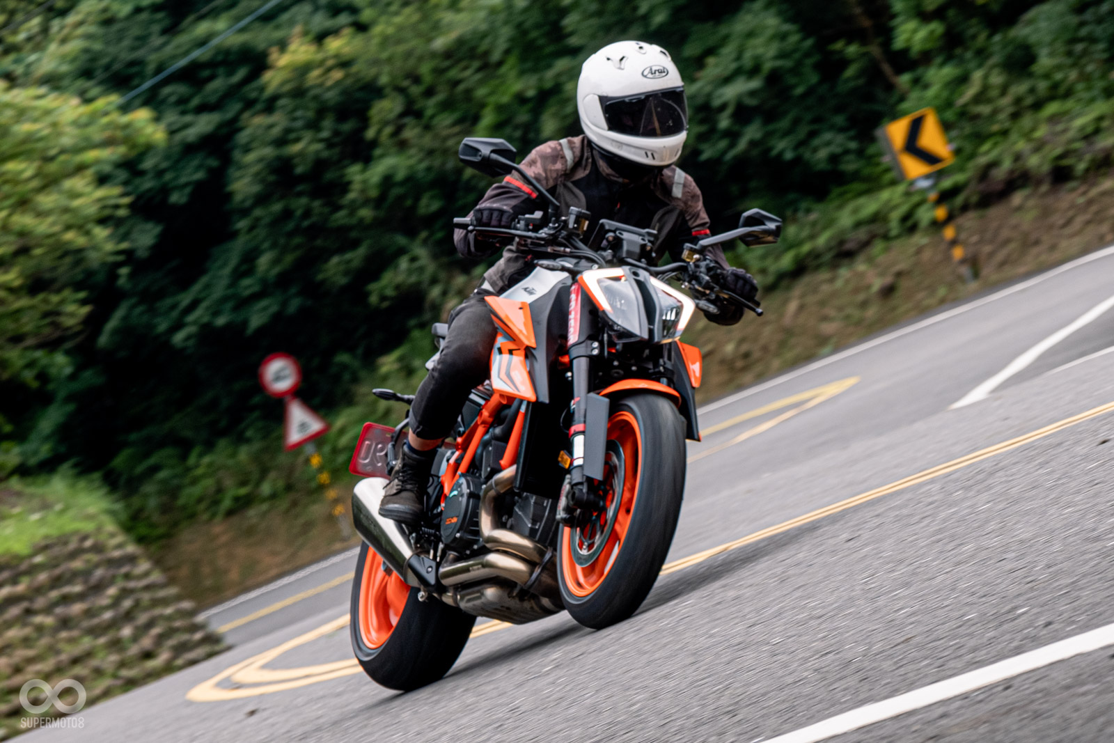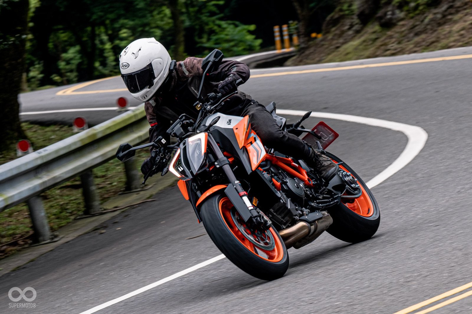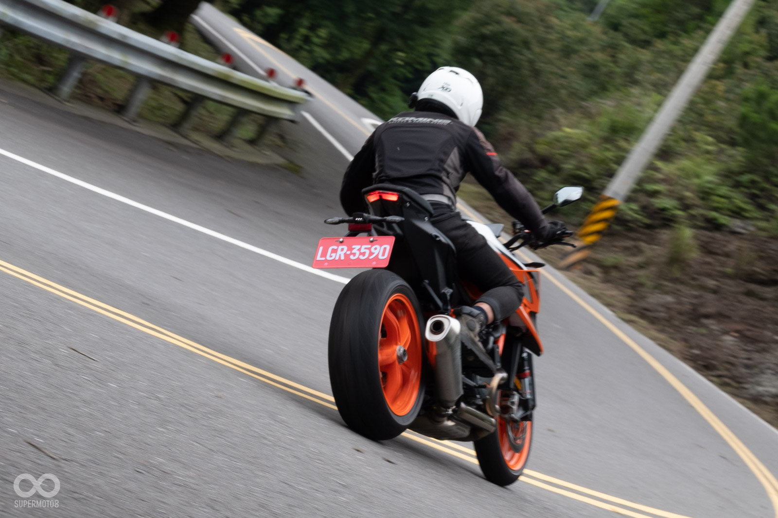 煞車性能,電控表現也是幾乎滿分的狀態,拉正車身補下油門,猛爆的動力直接釋放,在台灣的山路上騎乘你只會覺得這台車動力有點過大,而且在一些小細節例如過往許多運動街車,會因為造型緣故而犧牲雙腳挾持性,這次KTM也沒有發生這樣的問題,強悍的電控系統甚至會讓你明顯感受到大灌油門出彎時,電腦正努力抑制車頭不要抬起,提供完美的防護表現。
