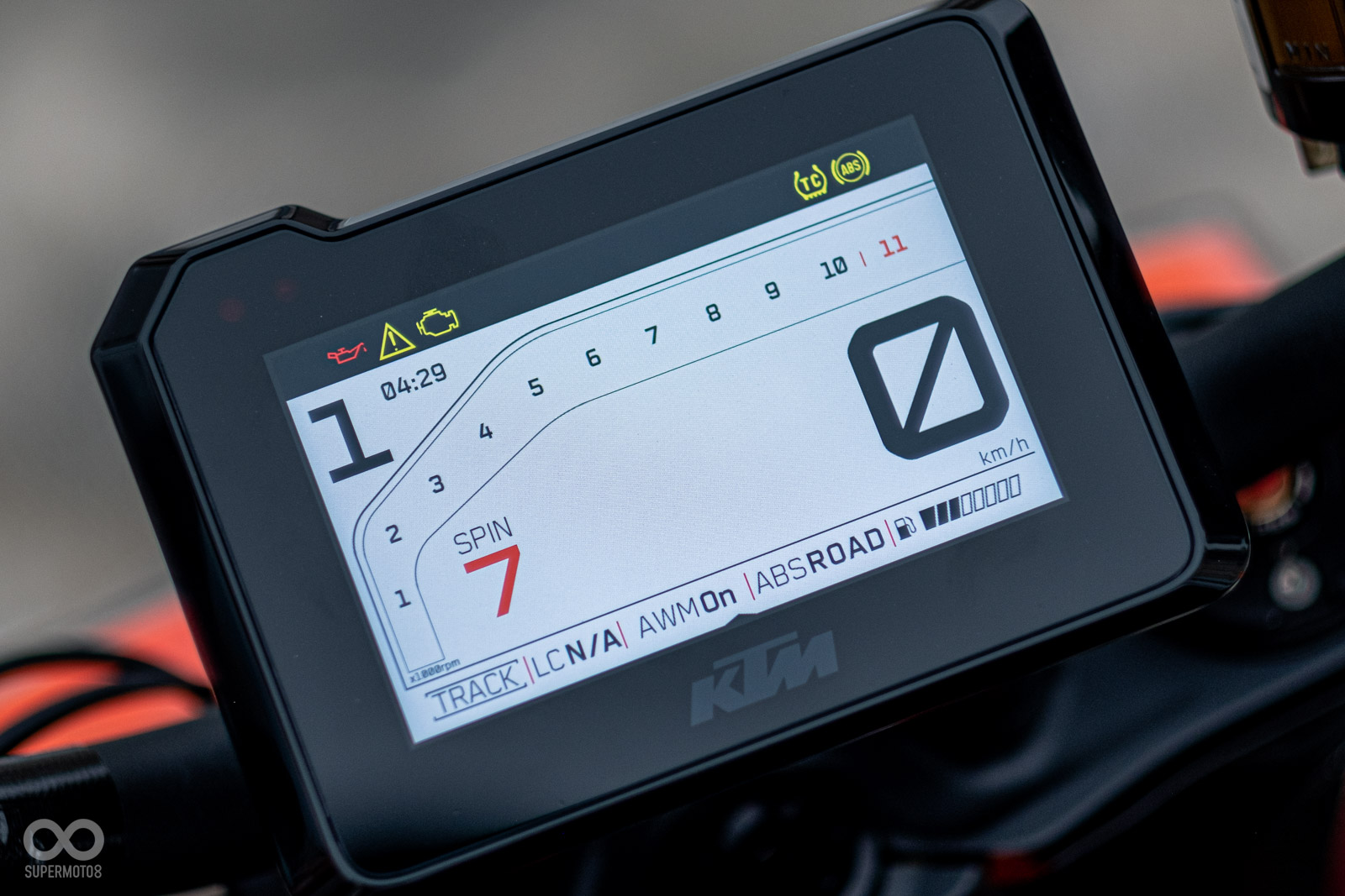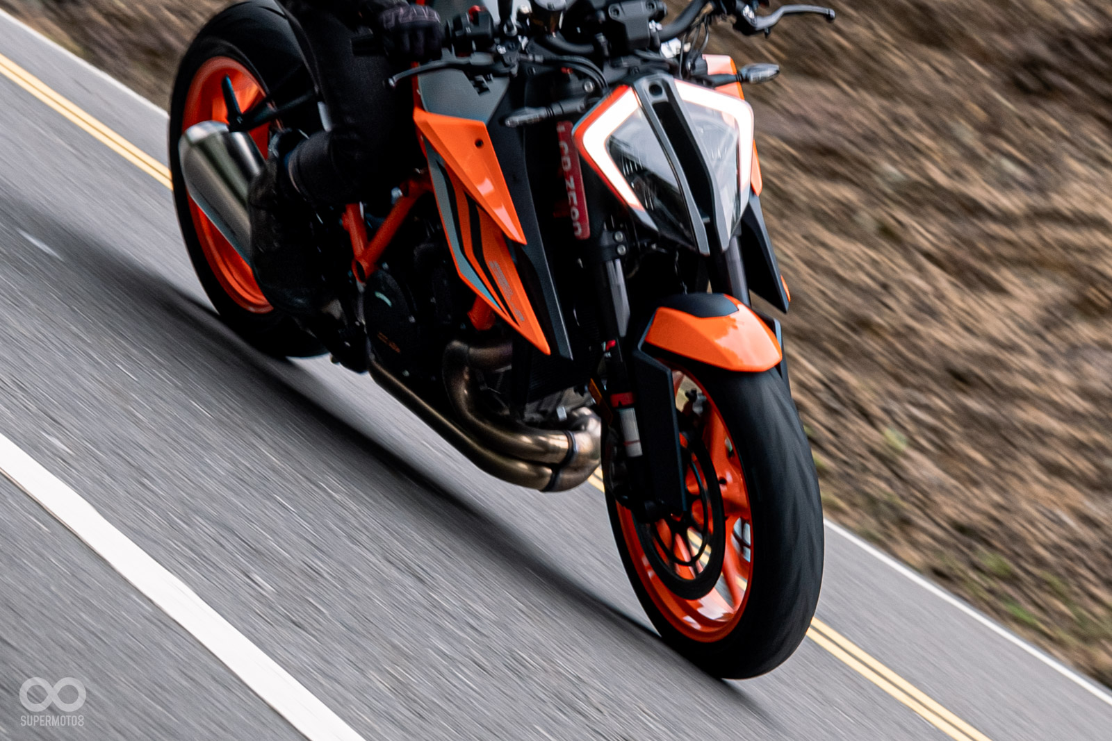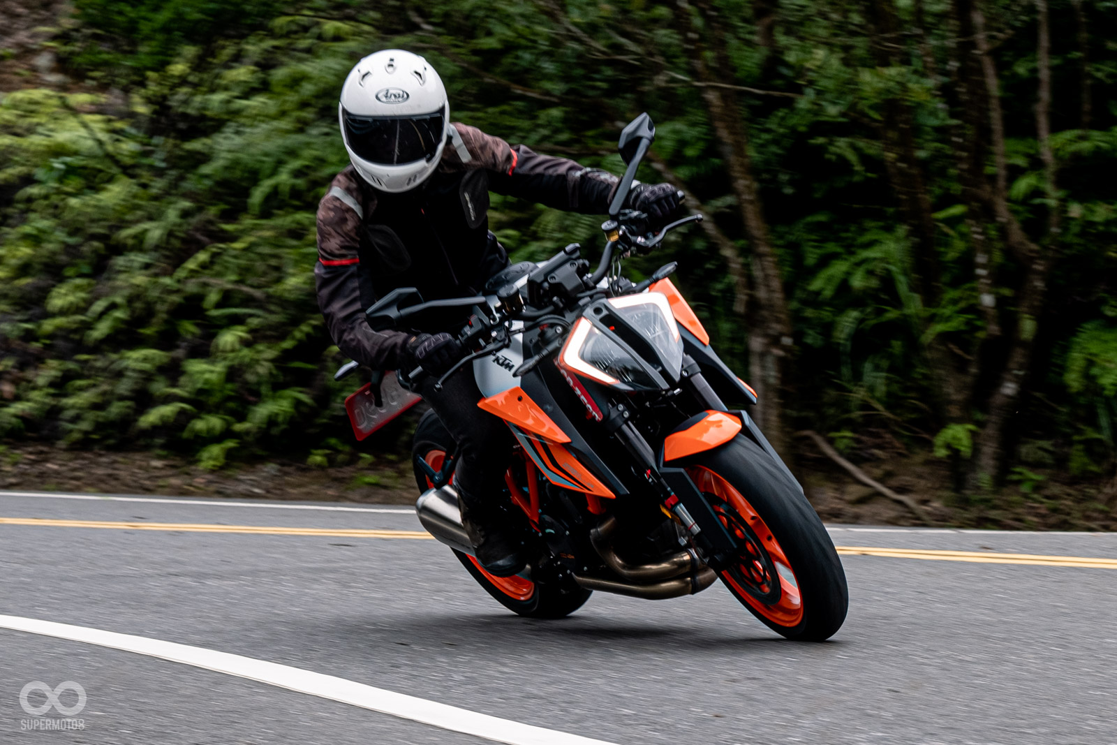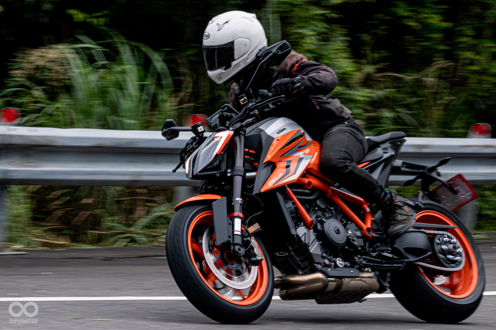 煞車性能,電控表現也是幾乎滿分的狀態,拉正車身補下油門,猛爆的動力直接釋放,在台灣的山路上騎乘你只會覺得這台車動力有點過大,而且在一些小細節例如過往許多運動街車,會因為造型緣故而犧牲雙腳挾持性,這次KTM也沒有發生這樣的問題,強悍的電控系統甚至會讓你明顯感受到大灌油門出彎時,電腦正努力抑制車頭不要抬起,提供完美的防護表現。