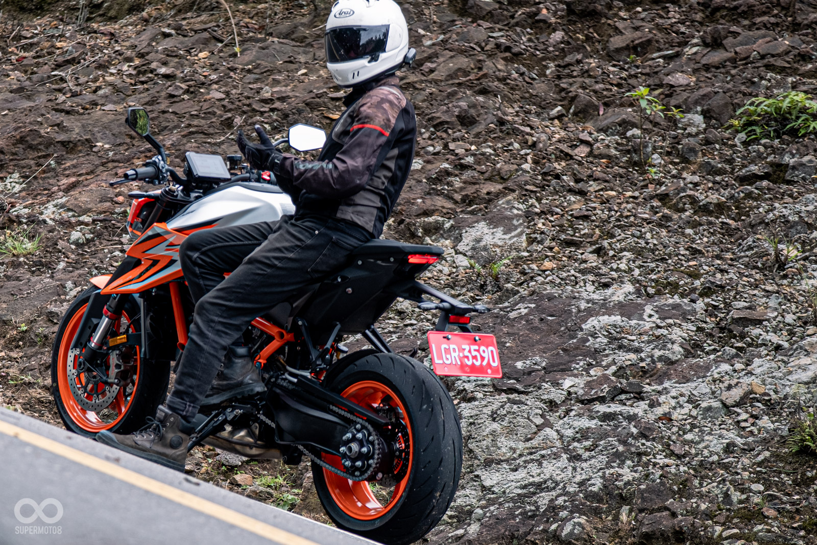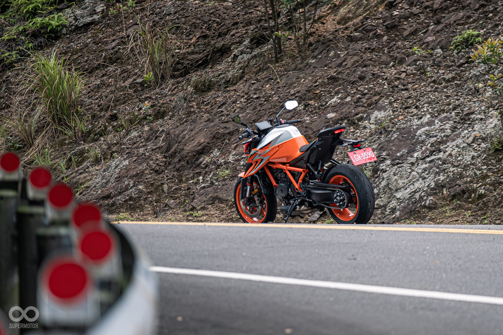 搭配KTM滑順的進退檔快排,進入山路中1290 SUPER DUKE R可以用相當快的節奏面對每個彎道,這時候驚人的靈活性再次湧現在這台車上,推倒車身進入彎中的速度與輕鬆程度,幾乎與MT-07、CB750 Hornet這類的中量級街車沒有太多差別,但換來的甚至是穩定到難以置信的平衡性,避震器在傾角下牢牢吸住地面,整台車的動態可以輕鬆快速掌握,給予騎士滿滿的信心。