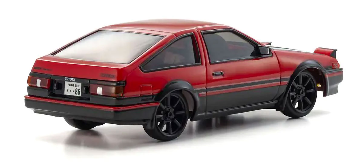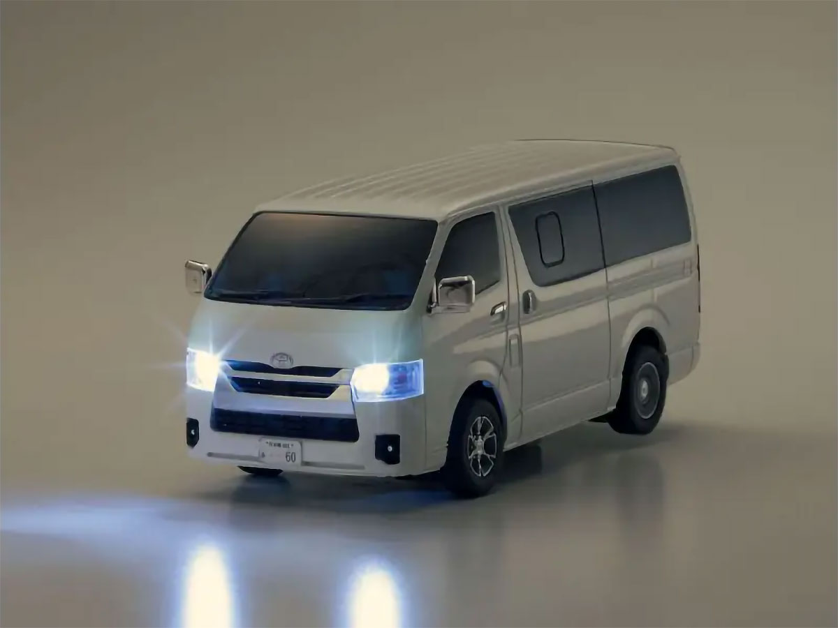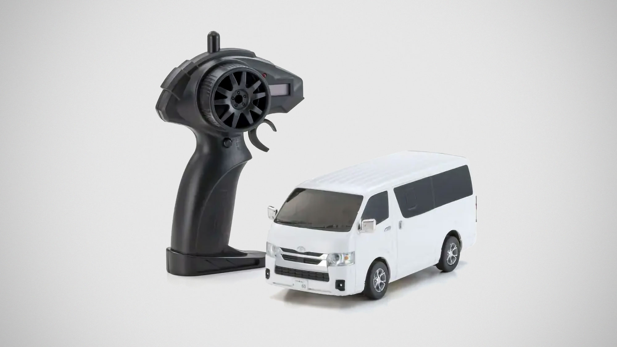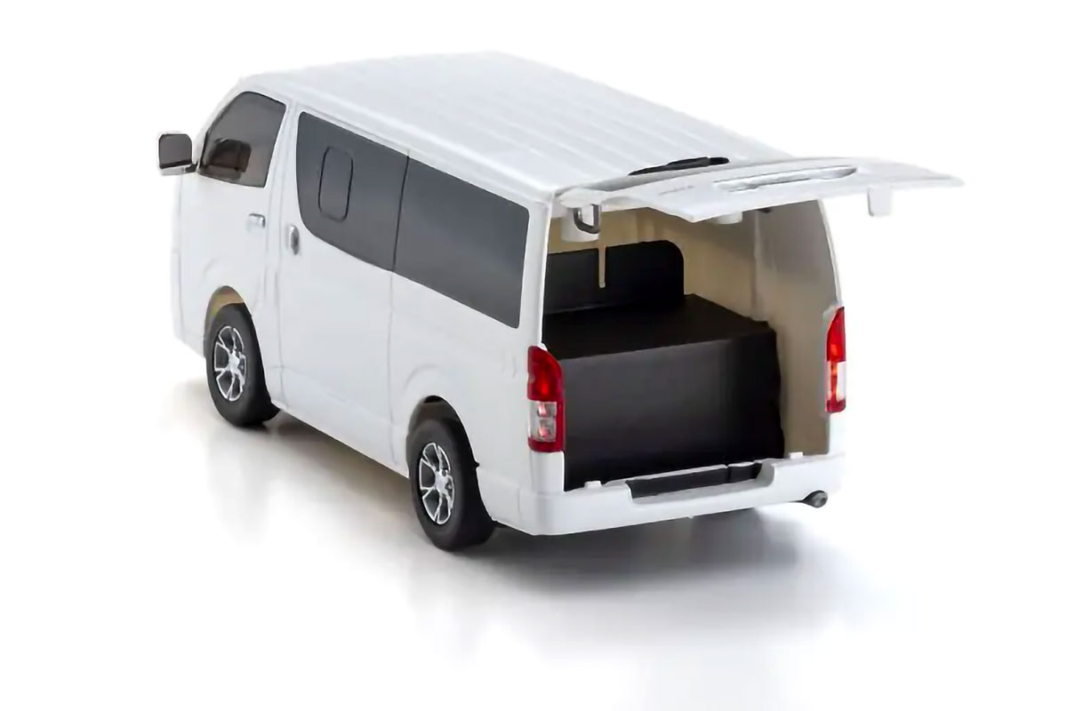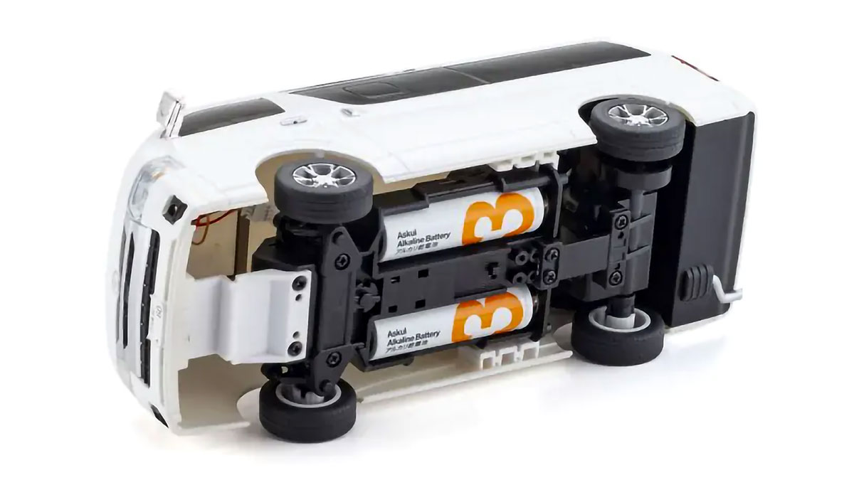Hiace 車型還特別設計了可開啟的後車門,內部雖然簡陋,但別有一番風味。每套產品包含車體、2.4GHz 遙控器(附秒錶功能)、迷你路障、調校工具和電池盒。Toyota Sprinter Trueno AE86 則提供黑紅和黑白兩種配色選擇,Hiace 則為白色。