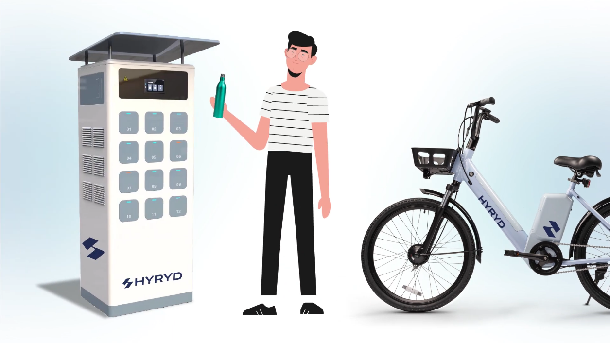 產生的氫氣儲存在9.8英吋高的瓶狀容器中,並插入自行車車架。搭載550瓦燃料電池的HydroRide自行車,每次充滿氫氣可行駛約60公里。更換氫氣瓶只需10秒鐘,方便快速。如果您不想在家製造氫氣,HydroRide未來將建立換瓶站,類似Gogoro的電池交換站,讓使用者快速更換氫氣瓶。