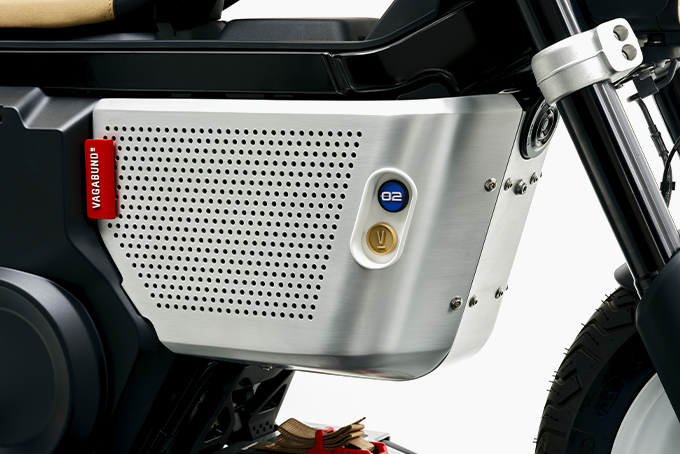 Vagabund Moto善用色彩與材質,突顯車體細節。原車座椅與偽油箱蓋的連接處被拆分,麂皮座墊與烤漆油箱蓋形成強烈對比。裸露鋁合金電池蓋與黑色動力單元融為一體,白色前輪與亮黃色Vagabund品牌支架則為車身增添活潑感。