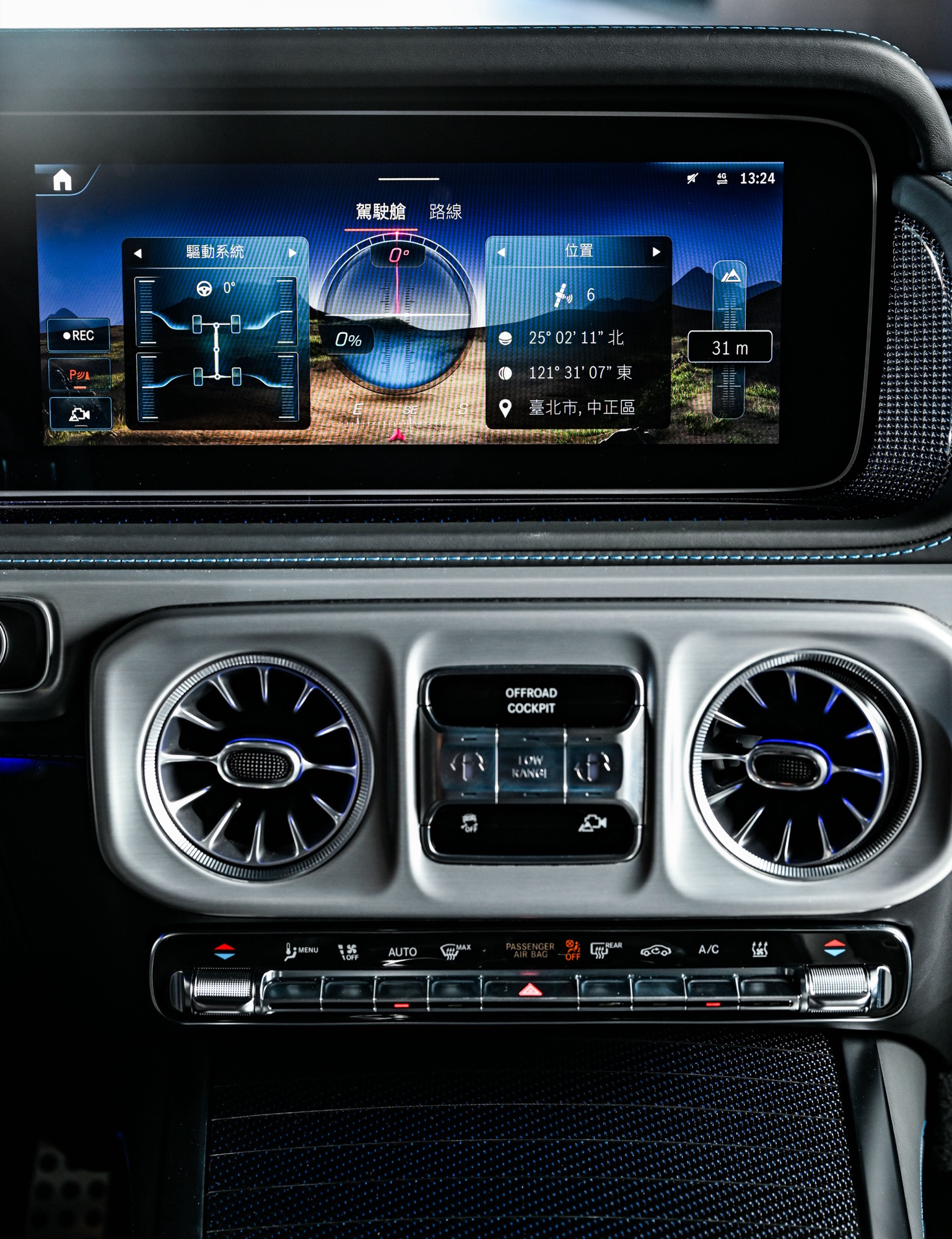 全新Offroad Cockpit提供駕駛「地表偵視功能」與越野專屬介面及資訊,包含水平線、定位、指南針、海拔、前軸轉向角、扭力輸出、胎壓與溫度,以及差速鎖的狀態,皆整合於全新雙12.3吋數位儀錶及中央觸控螢幕上。這一系列越野相關功能還進一步整合了差速鎖定控制鈕周圍,按鍵包含「手排模式」、「Low Range」、「Offroad Cockpit」使操作更加直覺,以更人性化設計提升全新G-Class專屬的豪華越野體驗。