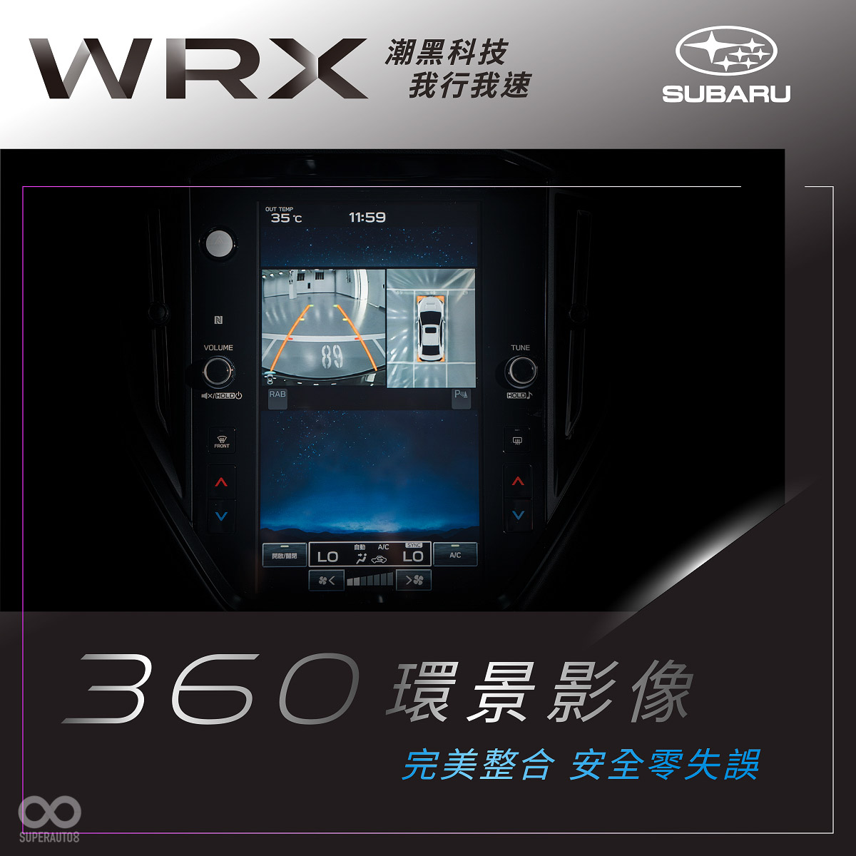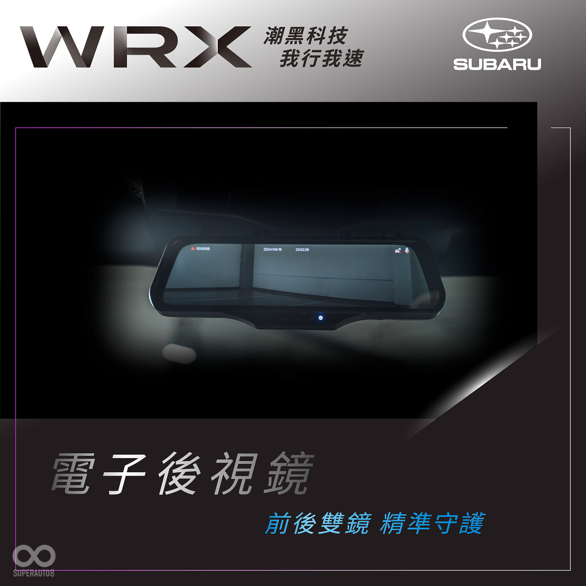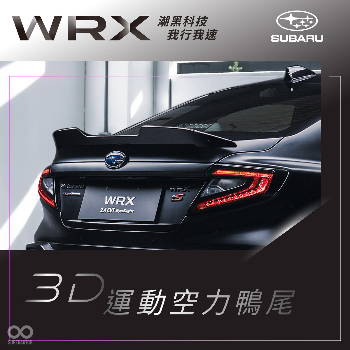 WRX 潮黑科技版承繼WRX的優異體質,搭載先進的SGP全球模組化底盤,與令人熱血賁張、可爆發出275 ps最大馬力及35.7 kgfm最大扭力峰值強勁動能的全新2.4L水平對臥渦輪增壓引擎,搭配SAWD對稱式全時四驅系統、先進電子懸吊系統搭配個性化駕駛模式(透過11.6吋智慧影音觸控螢幕隨心所欲選擇所需駕駛模式)及EyeSight4.0先進智能駕駛安全輔助系統等夢幻科技,完美演繹 加速貼背快感X平穩貼地操控 X 全方位安全駕駛 之間的絕佳平衡,為極限駕馭樂趣提供了堅實基礎。此外,WRX 潮黑科技版升級導入與原廠車載系統完美整合的360度環景影像系統以及高解析度電子後視鏡(具備智慧切換功能),前後雙鏡精準守護駕駛視野。