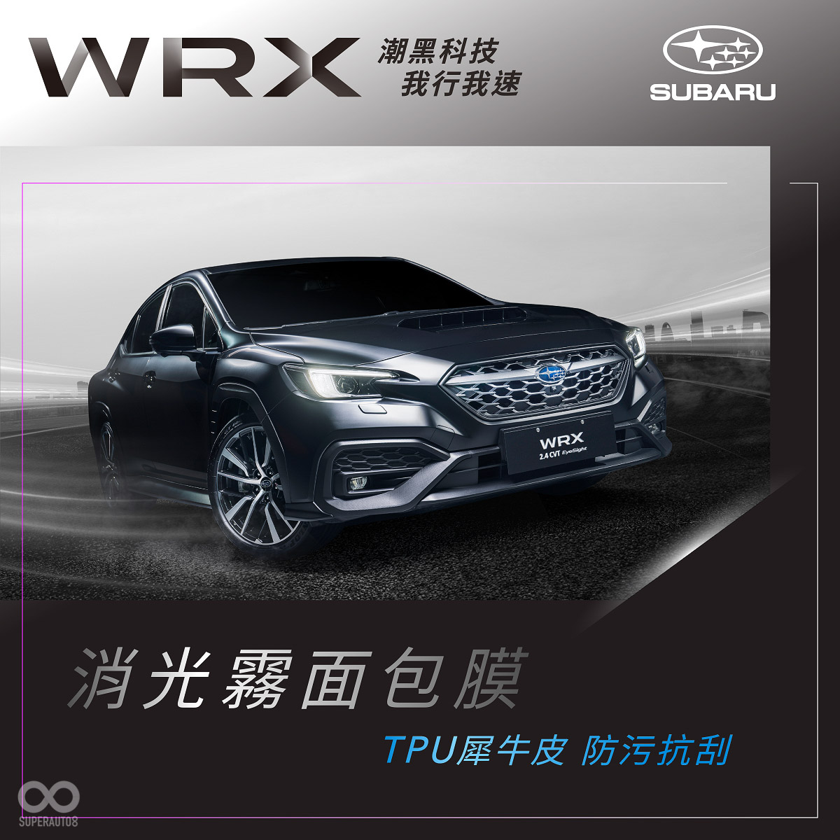 SUBARU旗下最膾炙人口的WRC傳奇超性能房車WRX,自上市以來以撼動感官極限的熱血性能及競速本格,堅守其承繼經典的拉力賽純正血統,成為國內同級運動跑房車的不二首選。為了創造更強烈的個性化風格,滿足車迷的渴望,SUBARU本月限量推出WRX 潮黑科技版,蘊藏狂勁能量的全車消光黑,以我行我速的姿態,暗自釋放不可一世的賁張,全台限量30台,優惠總值超過33萬,邀您前往指定SUBARU展間,一睹WRX潮黑科技版的酷帥風采。