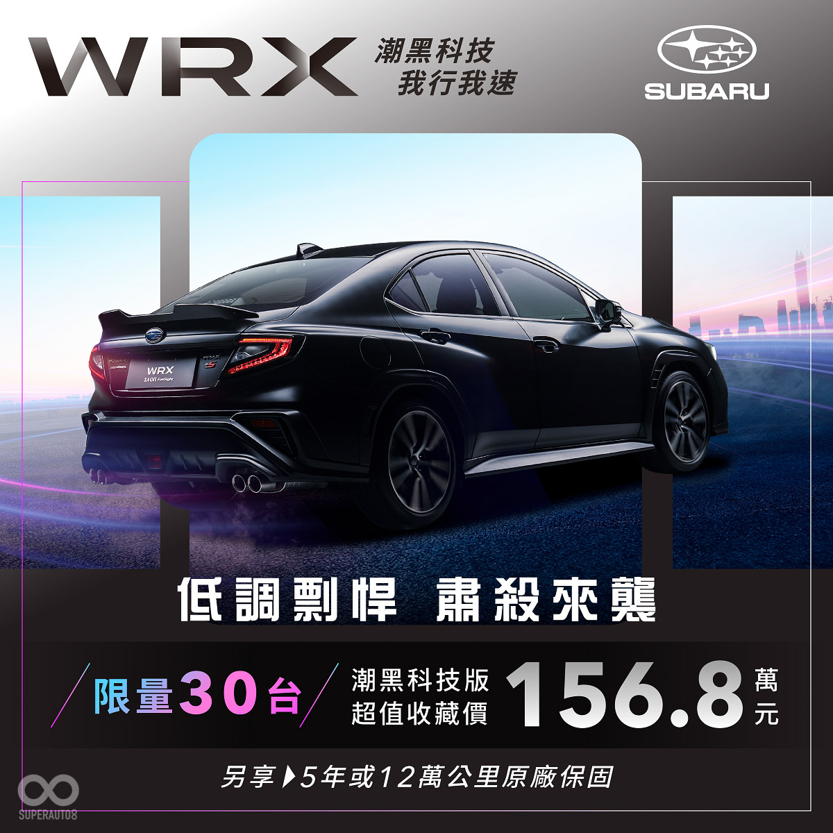 SUBARU WRX潮黑科技版即將於9月7日剽悍上市,本月入主即刻享有156.8萬限量收藏價(註)及5年或12萬公里原廠保固,全台限量典藏30台的珍稀名額,熱血的您千萬別錯過。本周末起新車將同步進駐指定SUBARU展示中心,敬邀渴望追求我行我速、特立獨行的您親臨鑑賞,親身感受上路即是目光焦點的潮黑暴力美學!