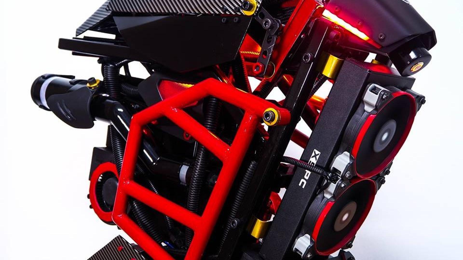 這個泰國3C達人將DUCATI最經典的管式車架作為主機的外部結構,利用焊接的管材製作成左右兩側支架,且支架漆成DUCATI的紅色識別色;底座部分也是由手工焊接製作,且底座與左右支架結合後會略微前傾,就像是MONSTER的車架角度使擬真度更高;支架內部則以拼裝方式置入主機板、顯示卡與記憶體等電腦配件,最特別的是主機上端特別以DUCATI MONSTER油箱的外型製作上蓋,並且採用水轉印的方式做成碳纖維花紋,底座的飾板也是採用相同方式製作,整體上就像是L型引擎安裝在一組管式車架上,一看就能辨別這是DUCATI的特徵。