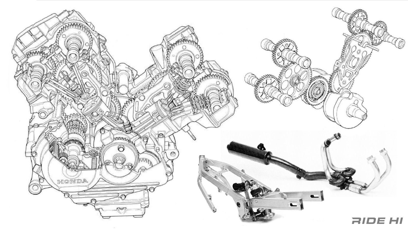 而這套引擎的真正奧妙在於 180 度曲軸,它讓左右兩邊的 V 型雙缸排氣系統緊密結合,並透過複雜的排氣設計,最大化了扭力輸出。這就像是 2 行程引擎的排氣管設計一樣經過精雕細琢,Honda 將這種技術完全發揮到了極致。