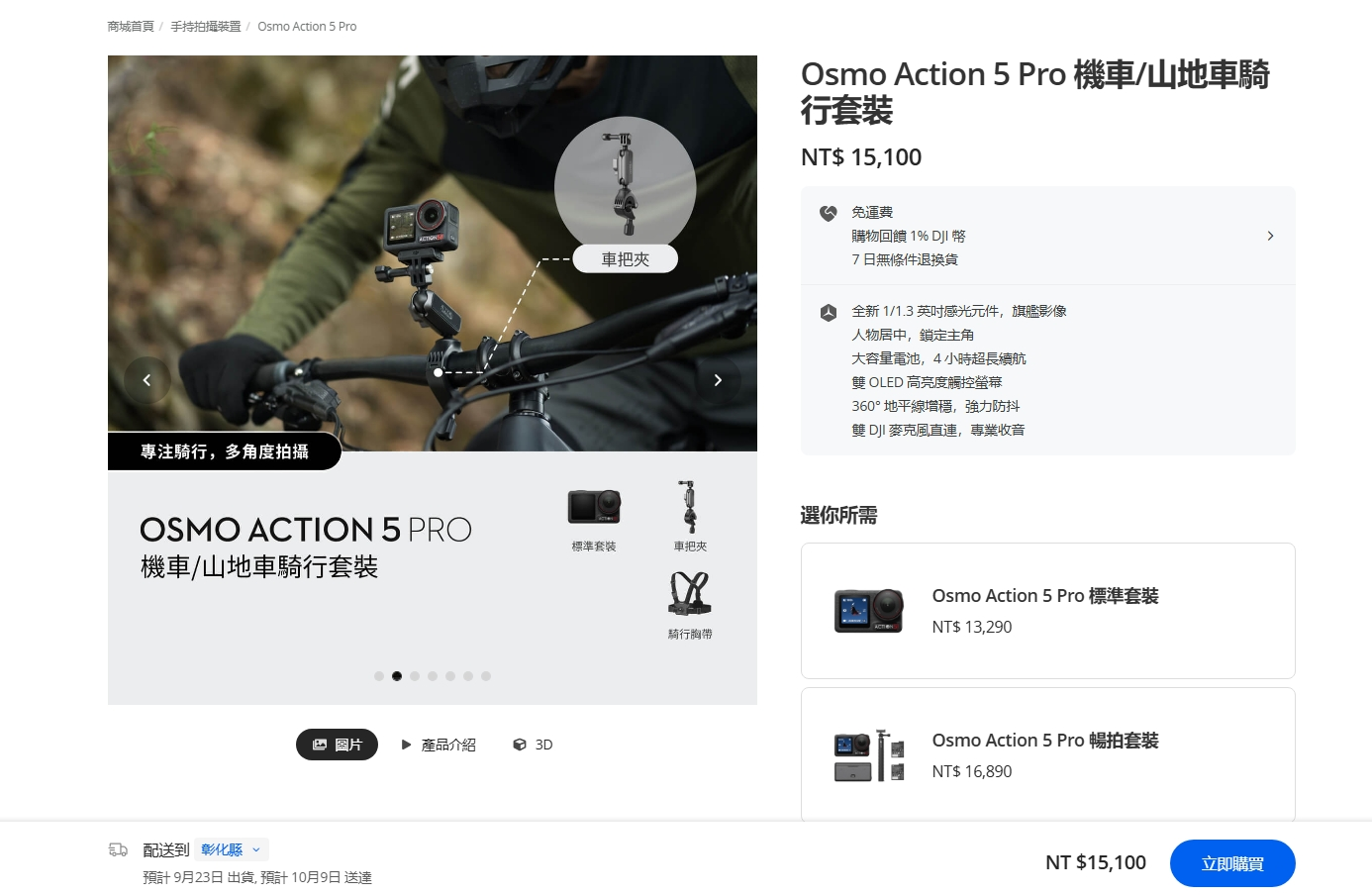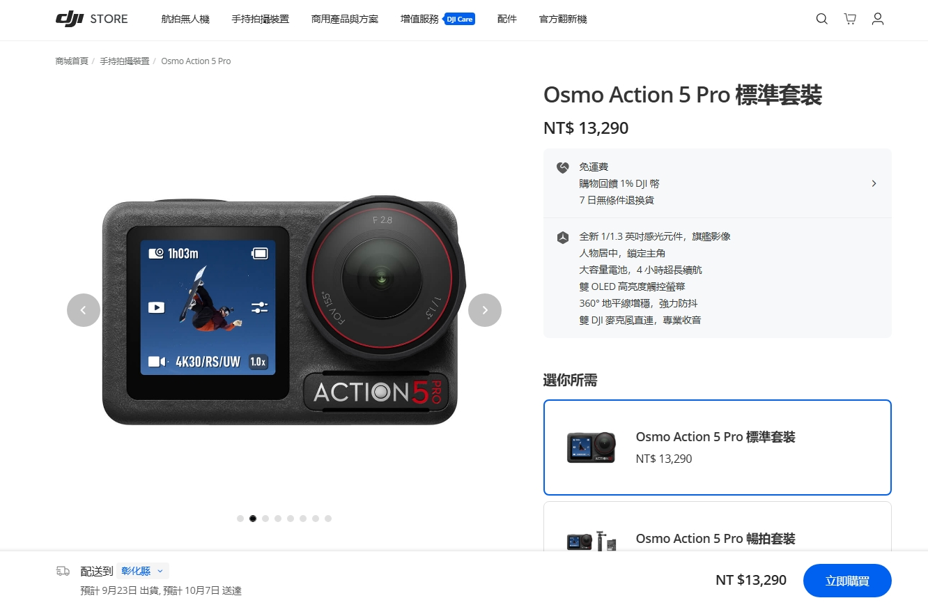 最重要的是,這台科技感爆棚的相機價格也非常親民:標準組合只要 13,290 元台幣,如果你需要多幾顆電池和其他配件,選擇 15,100 元 的 機車/山地車組合,立刻變身全能冒險家,無論你是要征服山路還是拍出血脈噴張的刺激畫面,Osmo Action 5 Pro 都能讓你毫不費力地拍出大片級作品。