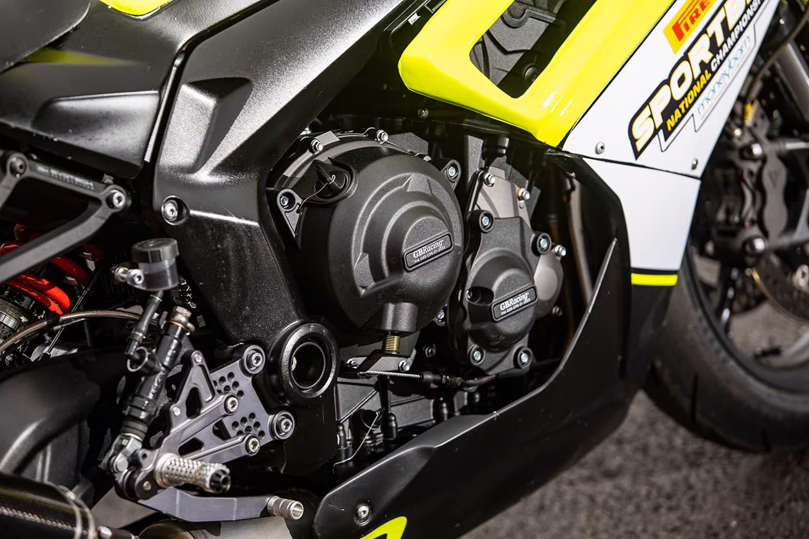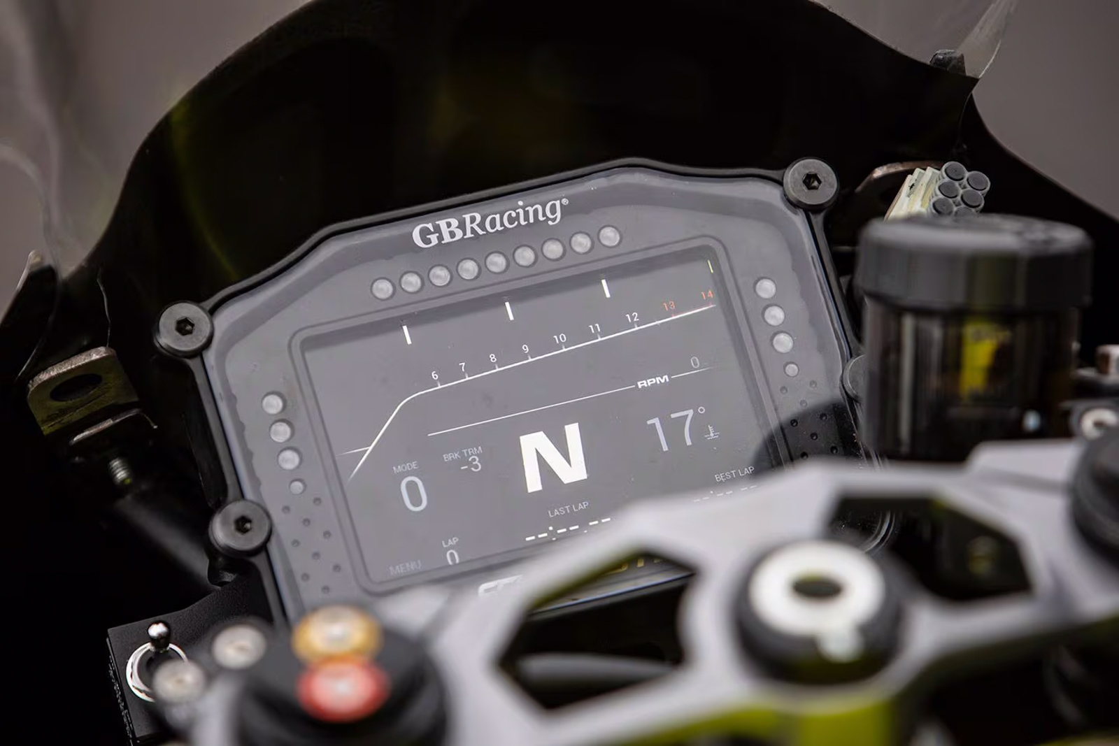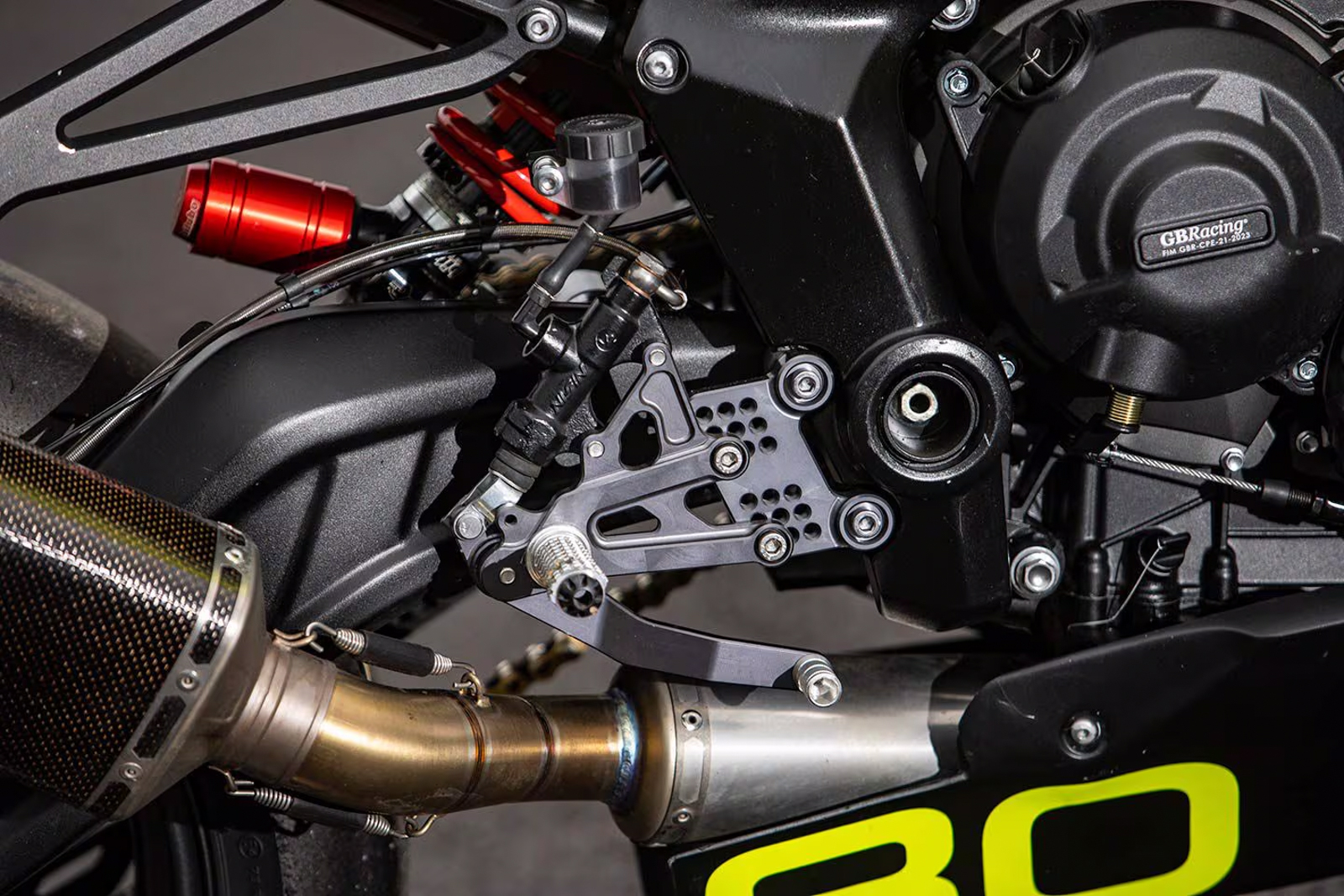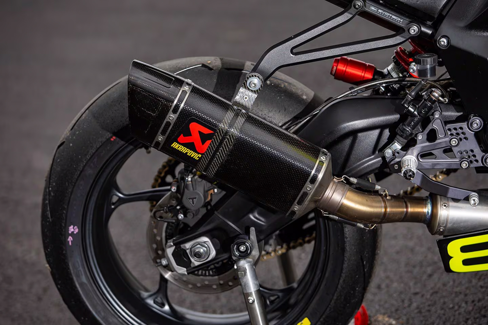 這台 Daytona 660 雖然仍保留了原廠引擎,但搭載了全套 Akrapovič 賽車排氣系統與經過調整的燃油噴射系統,最大馬力達到 97 匹,車架與搖臂則維持原廠設定,但裝配了全新的 Bitubo 可調避震器與防甩頭。