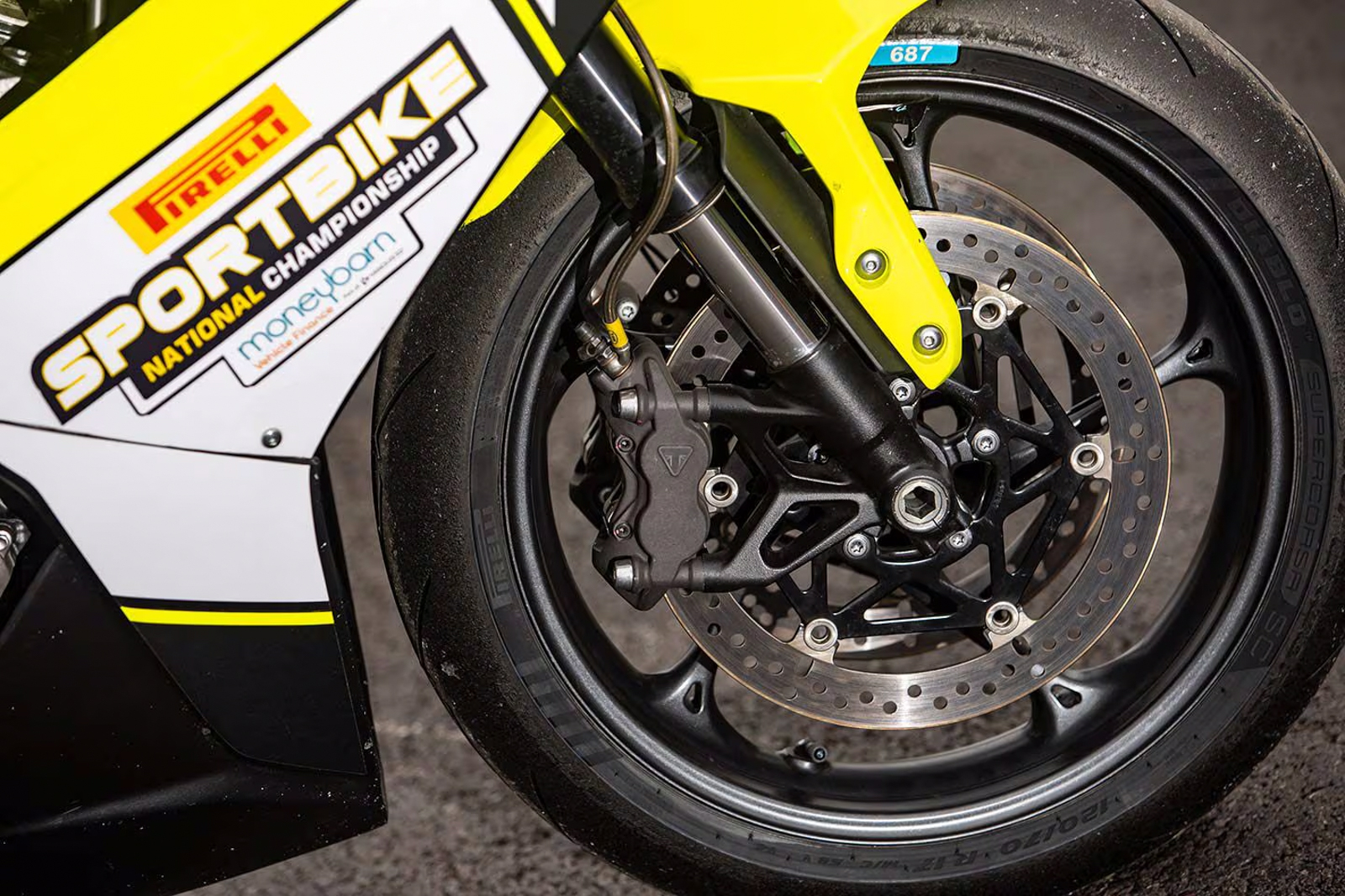 煞車系統使用標準卡鉗搭配 HEL 煞車油管、SBS 煞車皮與 Brembo 煞車碟,並移除了 ABS 系統以適應賽道需求,這些改裝讓 Daytona 660 能夠在激烈的比賽中保持穩定且優異的性能。