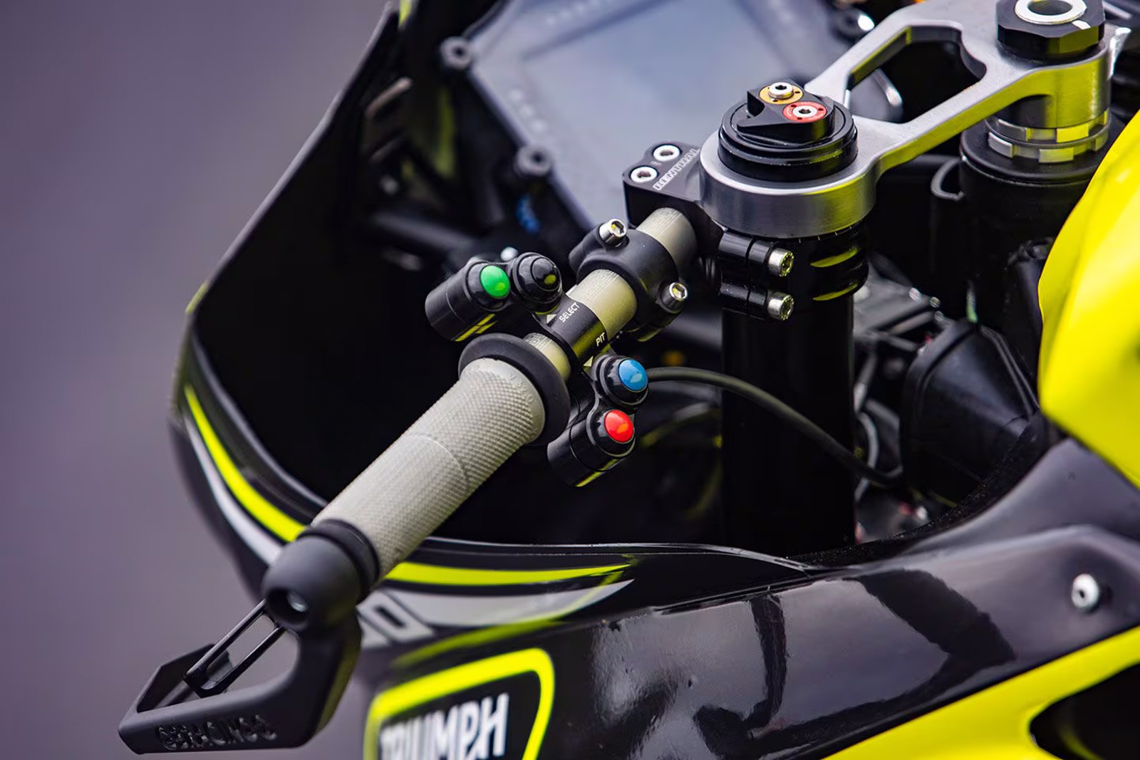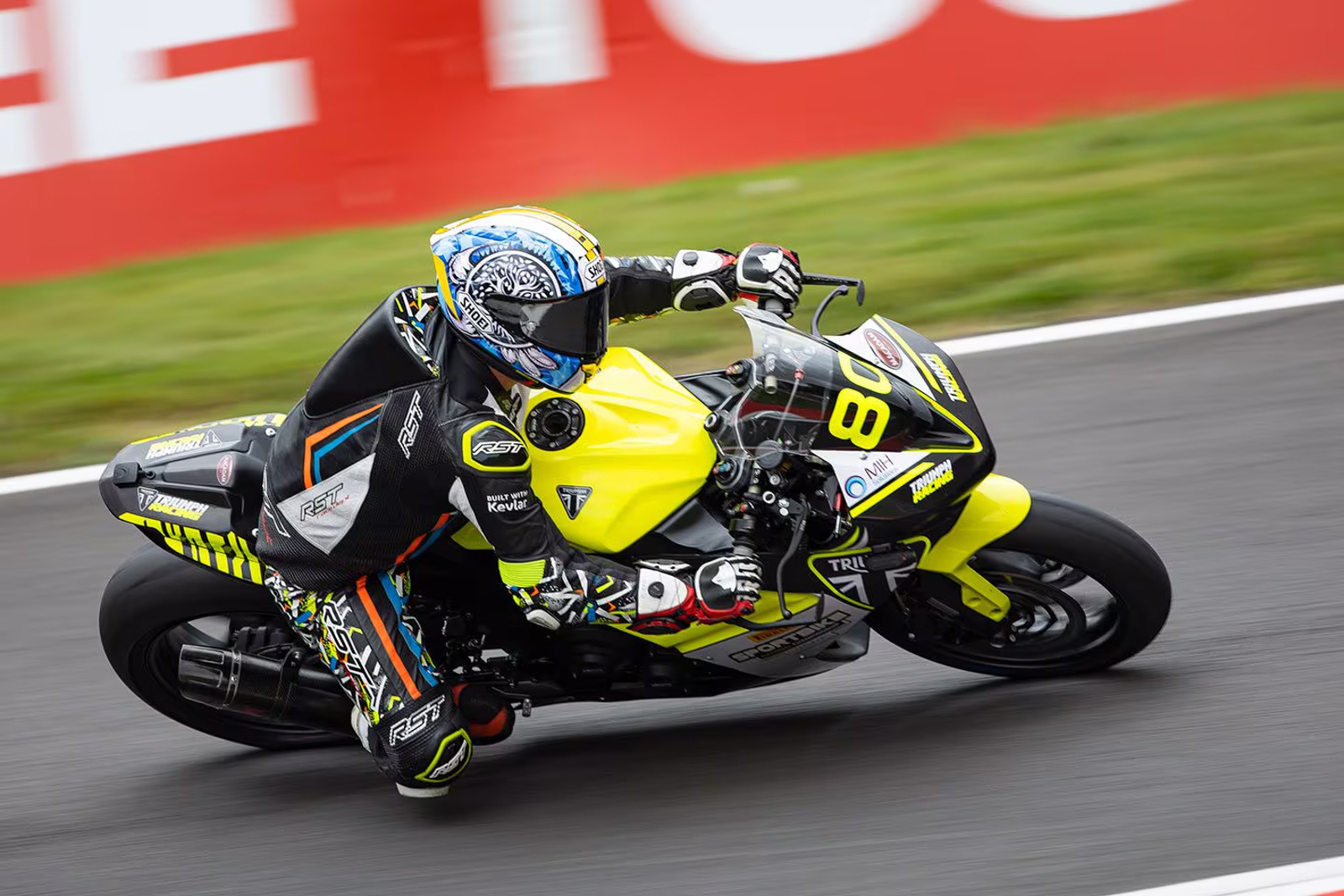 比賽當天的天氣挑戰不小,Cadwell Park 賽道因為雨後濕滑變得更加困難。外媒指出,Macadam Triumph Racing 團隊為應對這一情況,選擇配備 Metzeler 濕地輪胎,並調整 Bitubo 可調式懸吊系統以增強抓地力。此外,Daytona 660 還啟用了較柔的油門輸出模式和減少引擎剎車的設定,以提升操控穩定性。