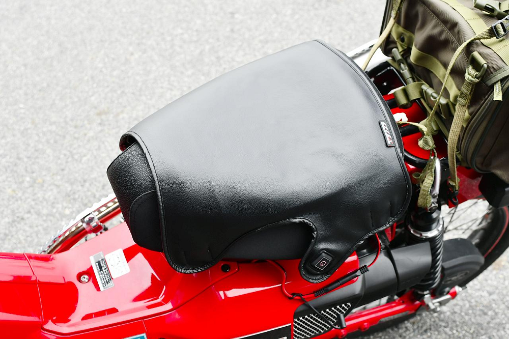 再來則是腿的部分,雖然在Honda Super Cub上有著類似「西裝」的擋板可以為車主擋風,但在CT125上卻沒有這個設計,於是他就自己裝上了一個擋風效果的擋板,讓你的腿部也可以減少受風面積。減少了手部和腿部的問題還不夠,這組套件還有加熱坐墊的設計,而且和加熱把手一樣可以透過USB充電。如果你懶得去接電瓶的電或是你不想一年四季都裝著他,可以直接透過隨身攜帶的行動電源進行供電即可,電源的部分還會隨著溫度顯示三種不同顏色。