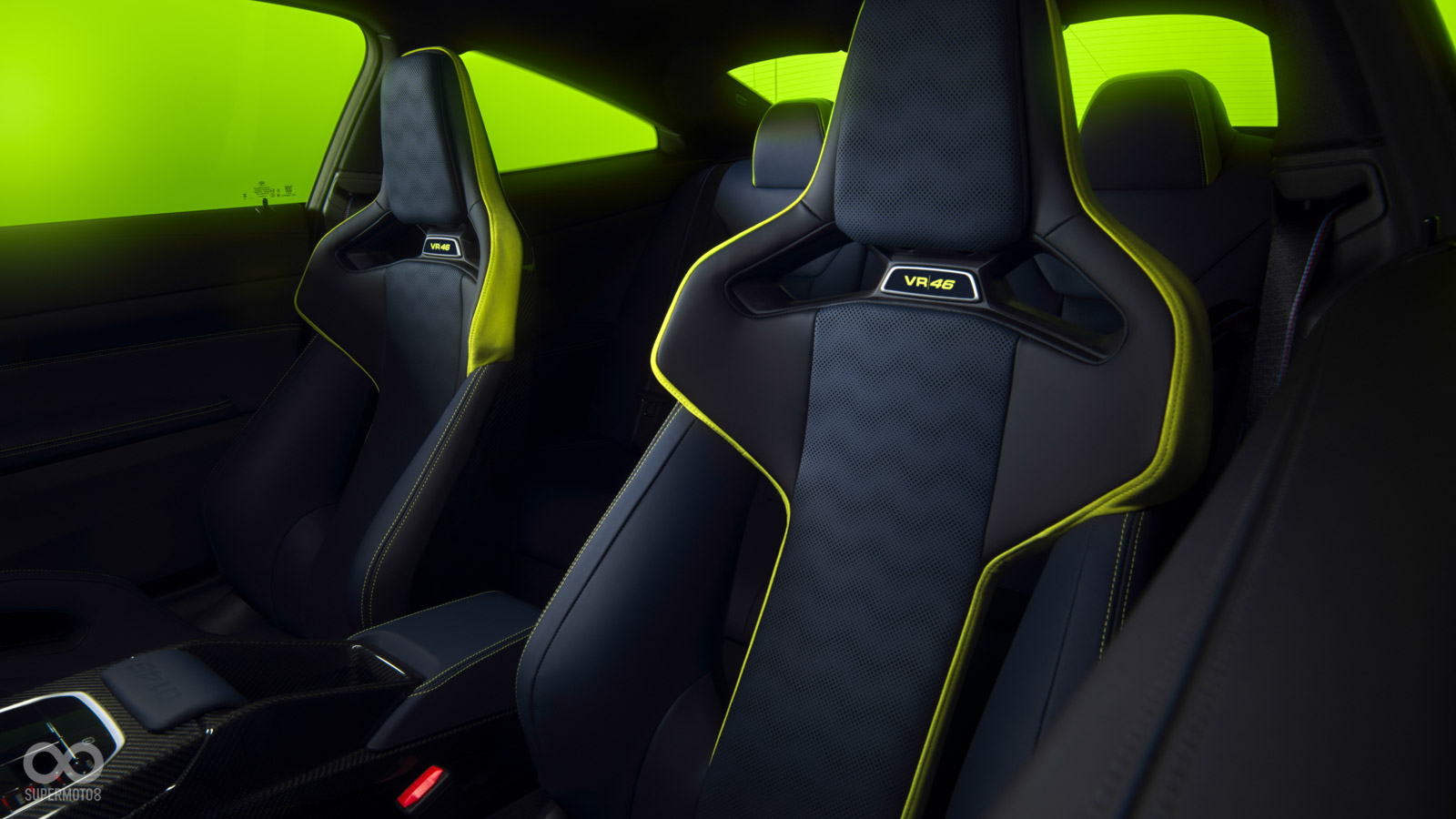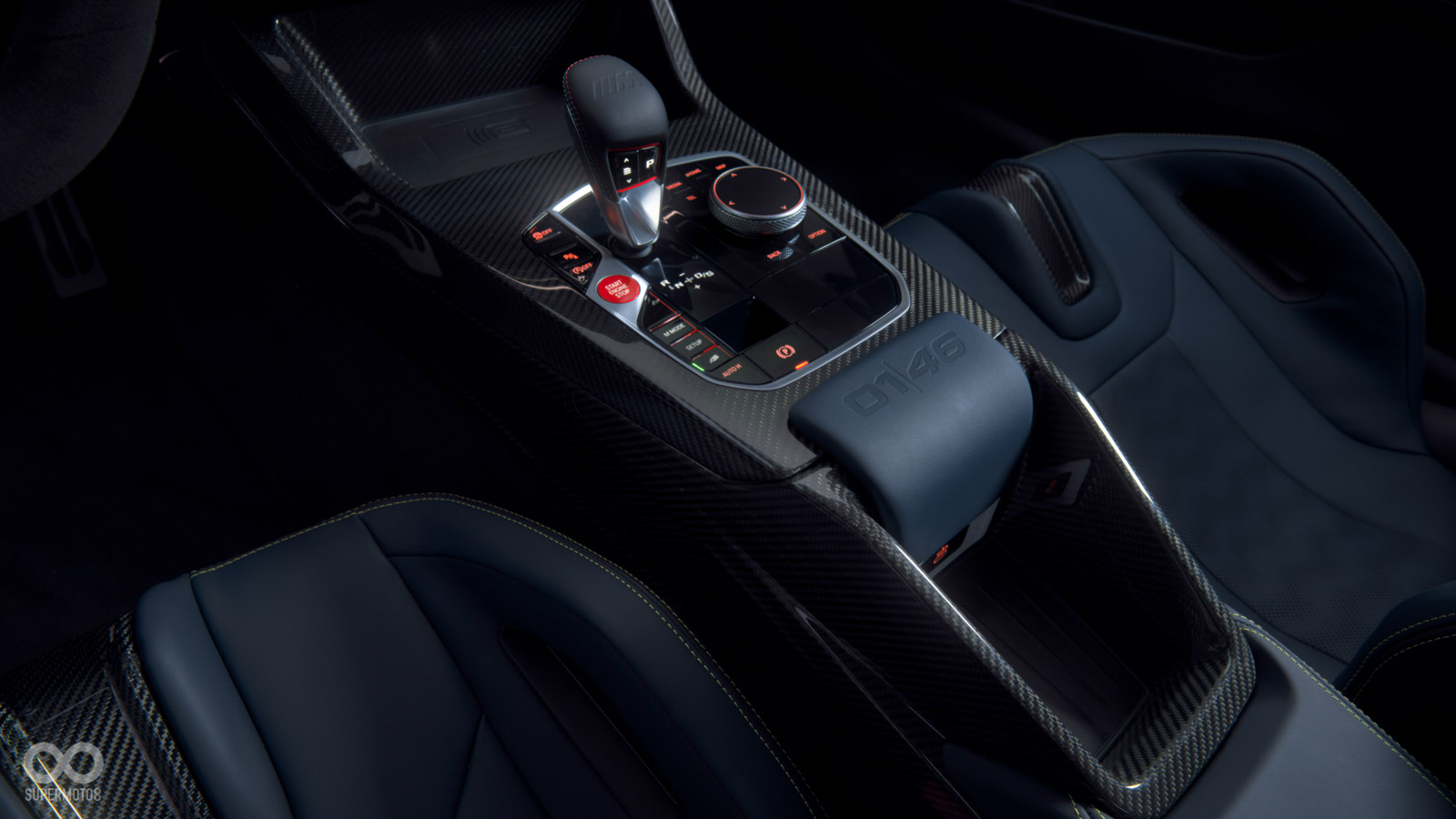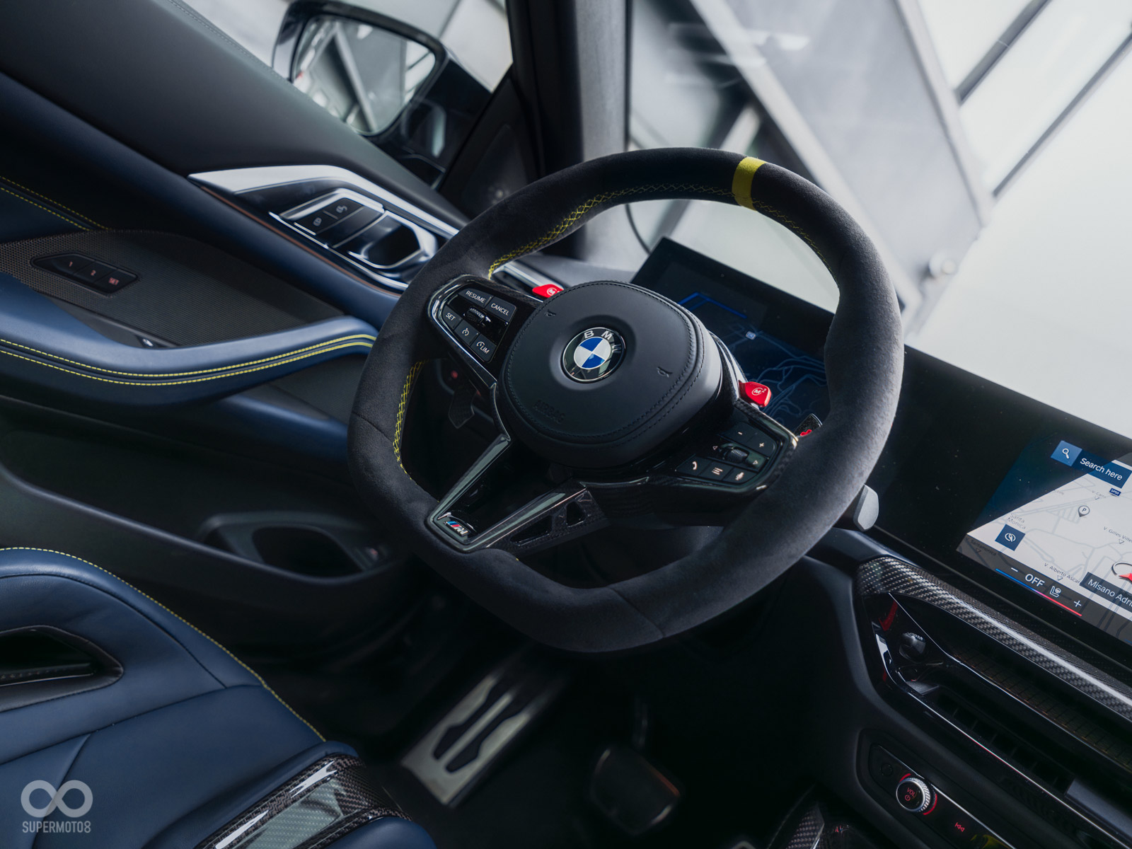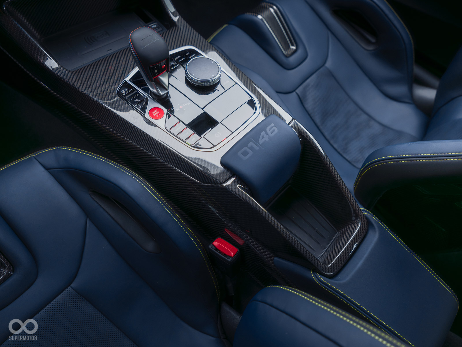 內裝部分,同樣展現高度專屬感,座艙以 夜藍色 Night Blue 為主調,搭配 黑色 Merino 皮革 M 碳纖維桶椅,肩部以 Sao Paulo Yellow Alcantara 點綴,營造極具運動感的視覺衝擊。方向盤採用 M Alcantara 平底三輻式設計,中央擁有黃色標記與對比縫線,而碳纖維中控台則鑲有「1/46」專屬銘牌,展現極致收藏價值。