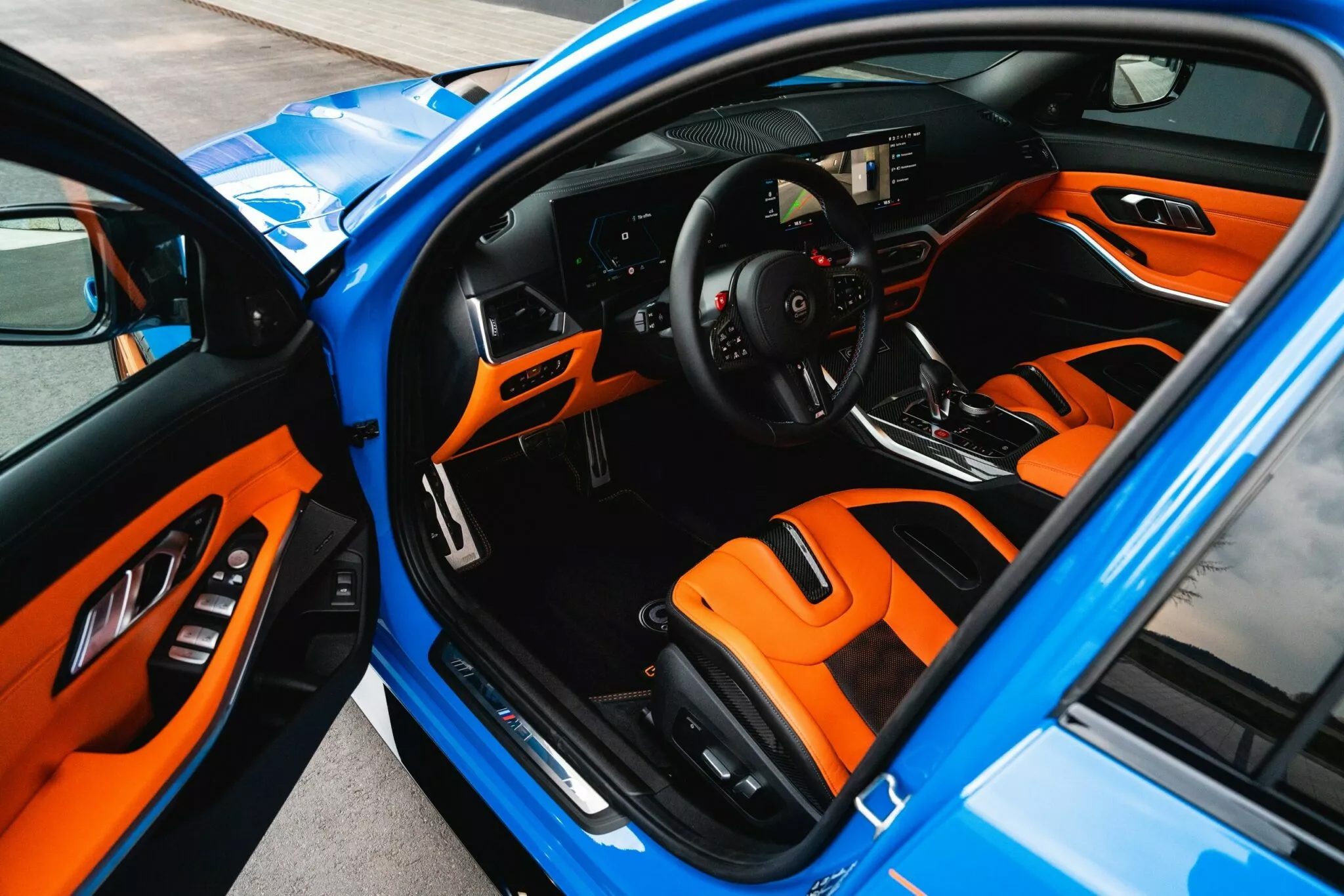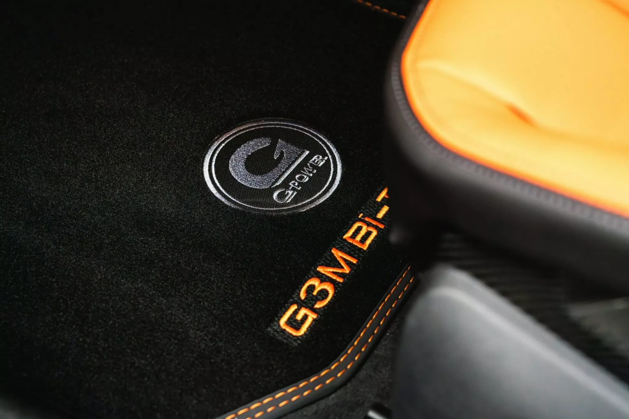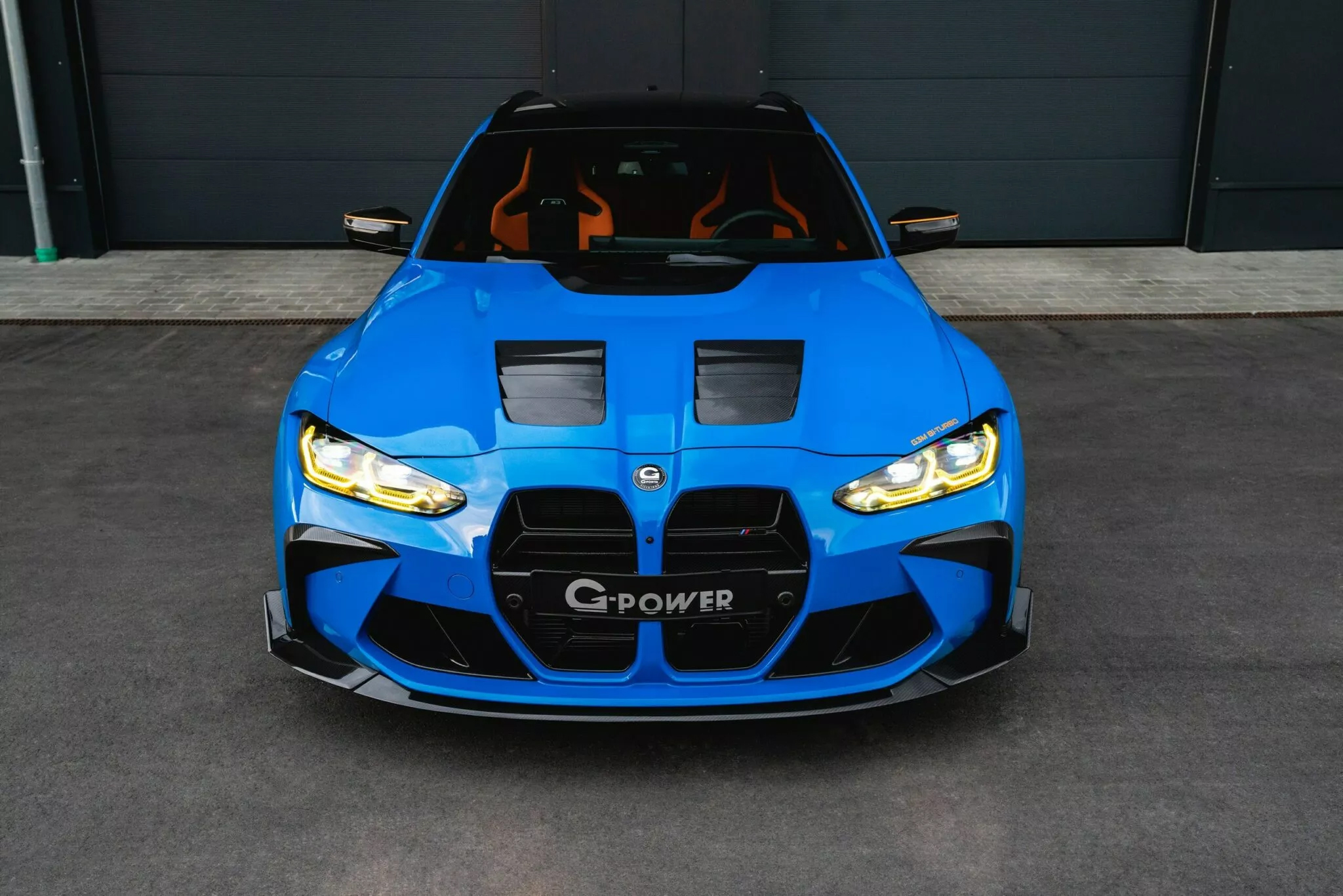 進入車內,這台G-Power版M3 Touring依舊不走低調路線。M碳纖維桶椅全面換上亮橘色皮革包覆,並延伸至儀錶板與車門飾板,強烈的對比配色讓內裝與外觀相互呼應,帶來極具賽車氛圍的駕駛體驗。