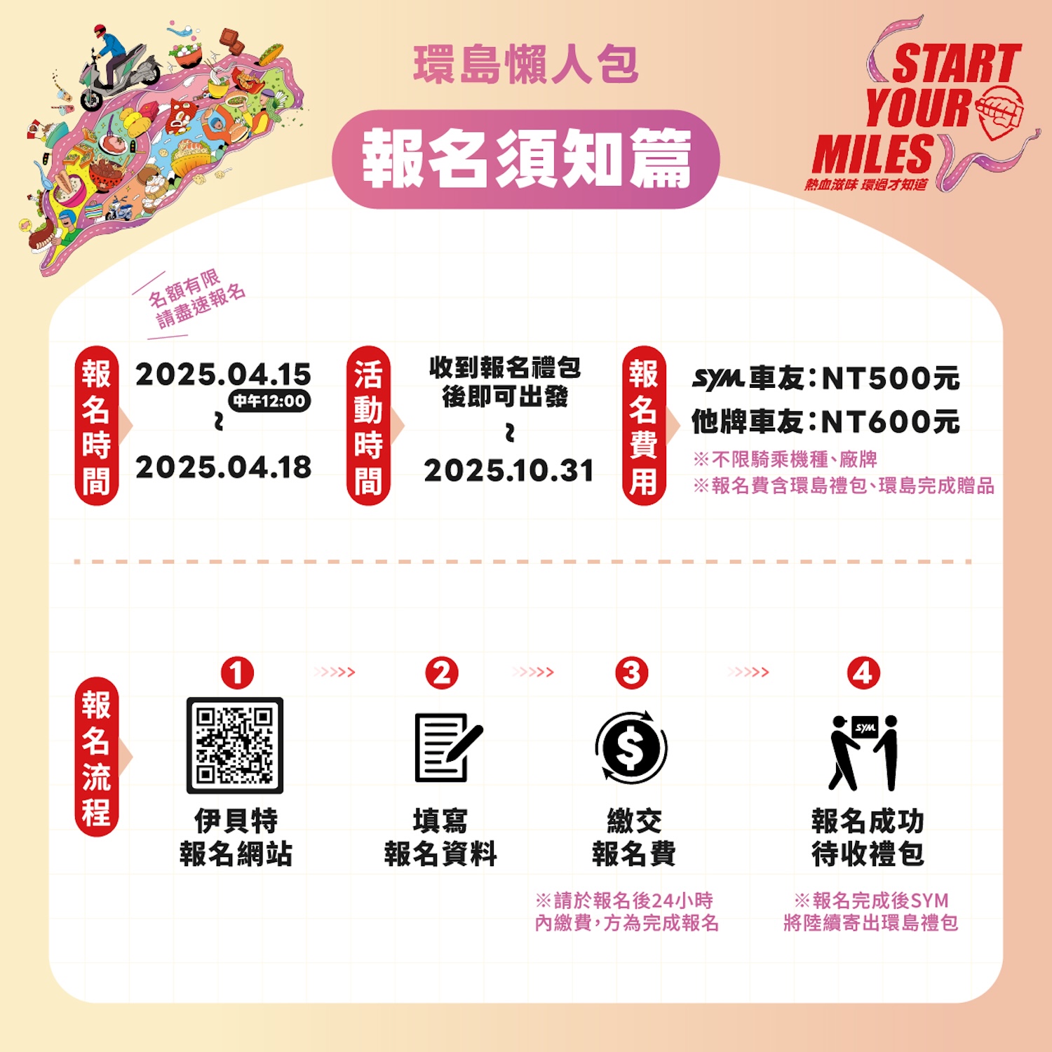 SYM 2025年環島活動將於4月15日中午12點正式開放報名,前往伊貝特報名網站,完成線上報名並繳交費用即報名成功。報名完成後,第一波報名禮包將於4月23日起陸續寄出。