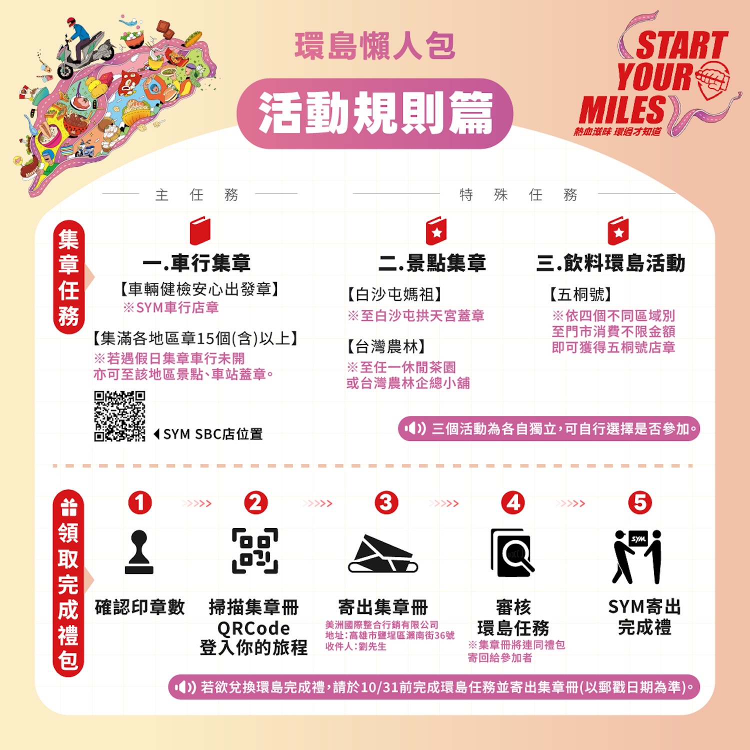 為保障車友們長途騎乘的安全,將印章設置於SYM SBC車行,蓋章之餘車行協助基礎檢查,讓車友與愛車享有一趟美好又安心的環島。除車行集章外,SYM特別新增「特殊任務景點集章」,至「白沙屯拱天宮」與「台灣農林」任一台灣農林休閒茶園及門市蓋章,還可進一步感受台灣的文化底蘊與茶香風情。另外,旅途中若行經SYM新竹總部蓋章,也可領取舒跑飲品讓元氣加分。