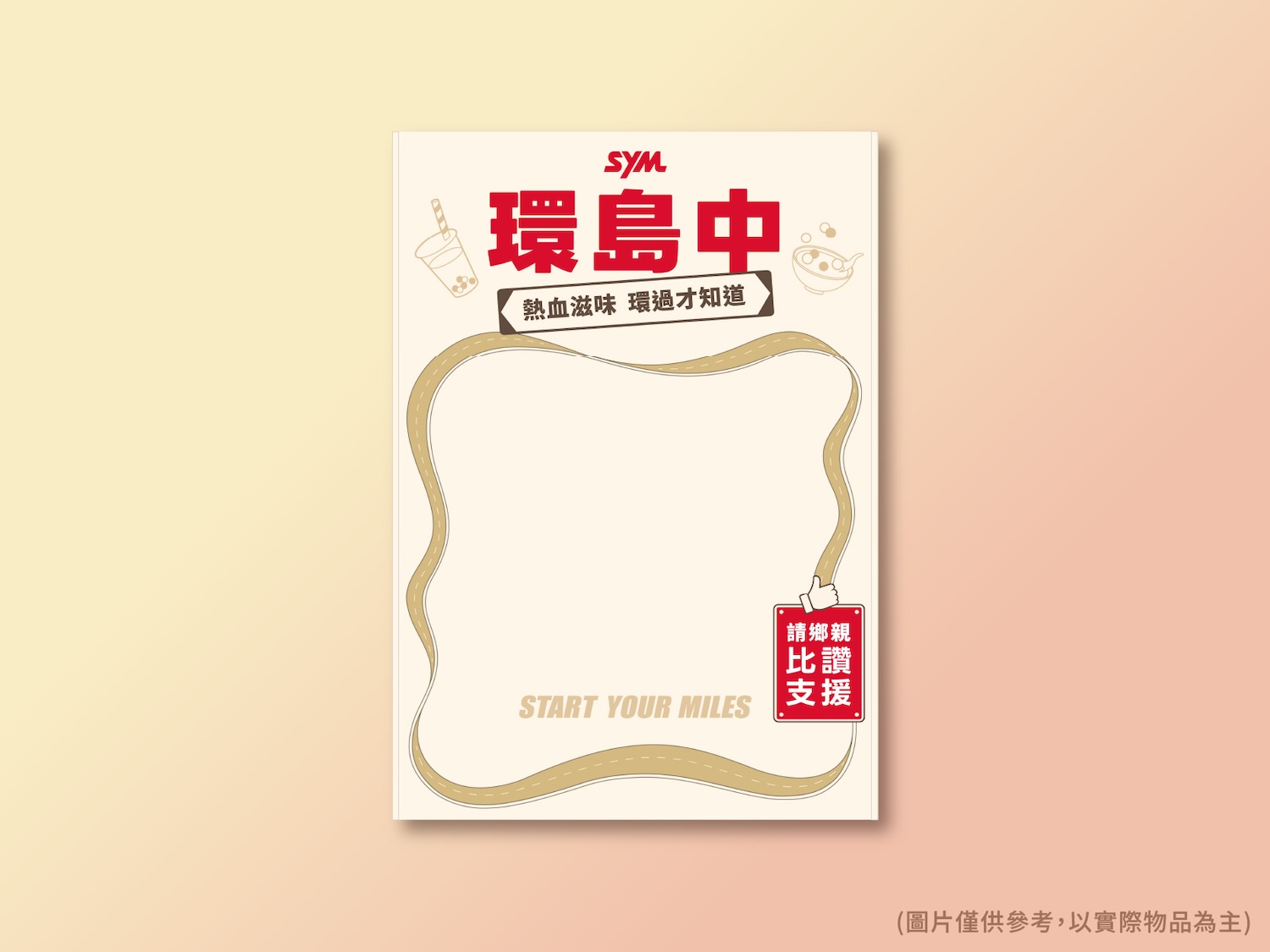 環島集章冊*1、環島宣示布旗*1、環島紀念T-shirt*1、環島飲料提袋*1、可摺疊收納後背包*1、Biore A極效防曬噴霧 (90g)*1、五桐號飲品折價券*1、JINS TAIWAN SYM限定款魔術頭巾*1、SYM聯名白沙屯平安符*1