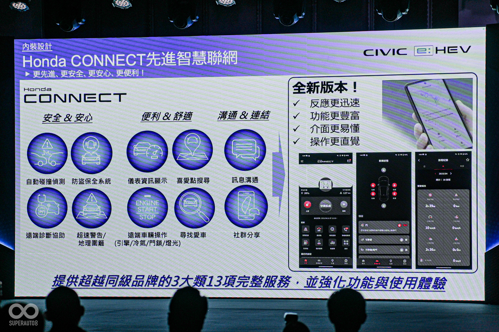 2025年式CIVIC e:HEV導入最新Honda CONNECT智慧聯網系統,具備遠端遙控、車況監控、即時定位與緊急救援等多項功能,新增線上訂閱與付款服務,最低月費99元起,讓車主享有前所未有的便利移動體驗。