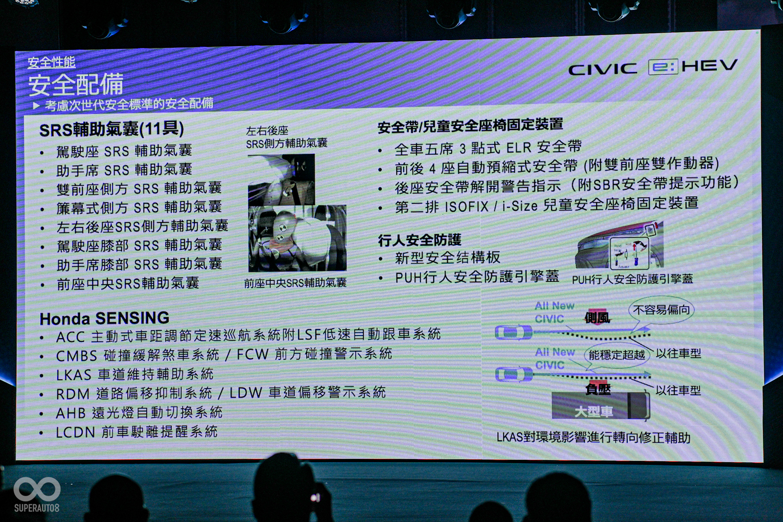 安全性方面,CIVIC e:HEV全面搭載Honda SENSING智慧駕駛輔助系統,採用100度超廣角鏡頭與高速影像處理晶片,具備車道維持輔助、ACC全速域巡航、碰撞緩解煞車、前車駛離提醒與道路偏移抑制等主動安全科技。配合三模式倒車攝影、PSS停車雷達與全車11具SRS氣囊,高剛性車體結構與PUH行人保護設計,提供駕駛與乘客最全面的主被動守護。